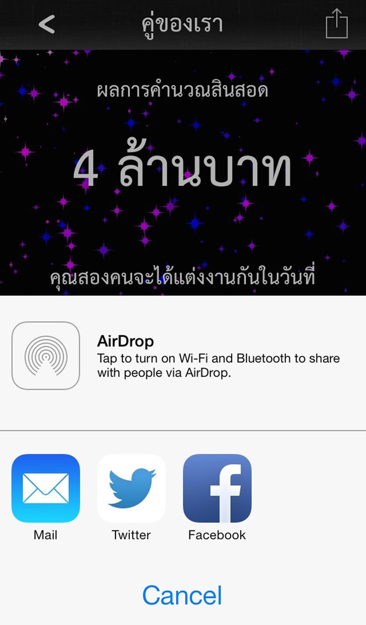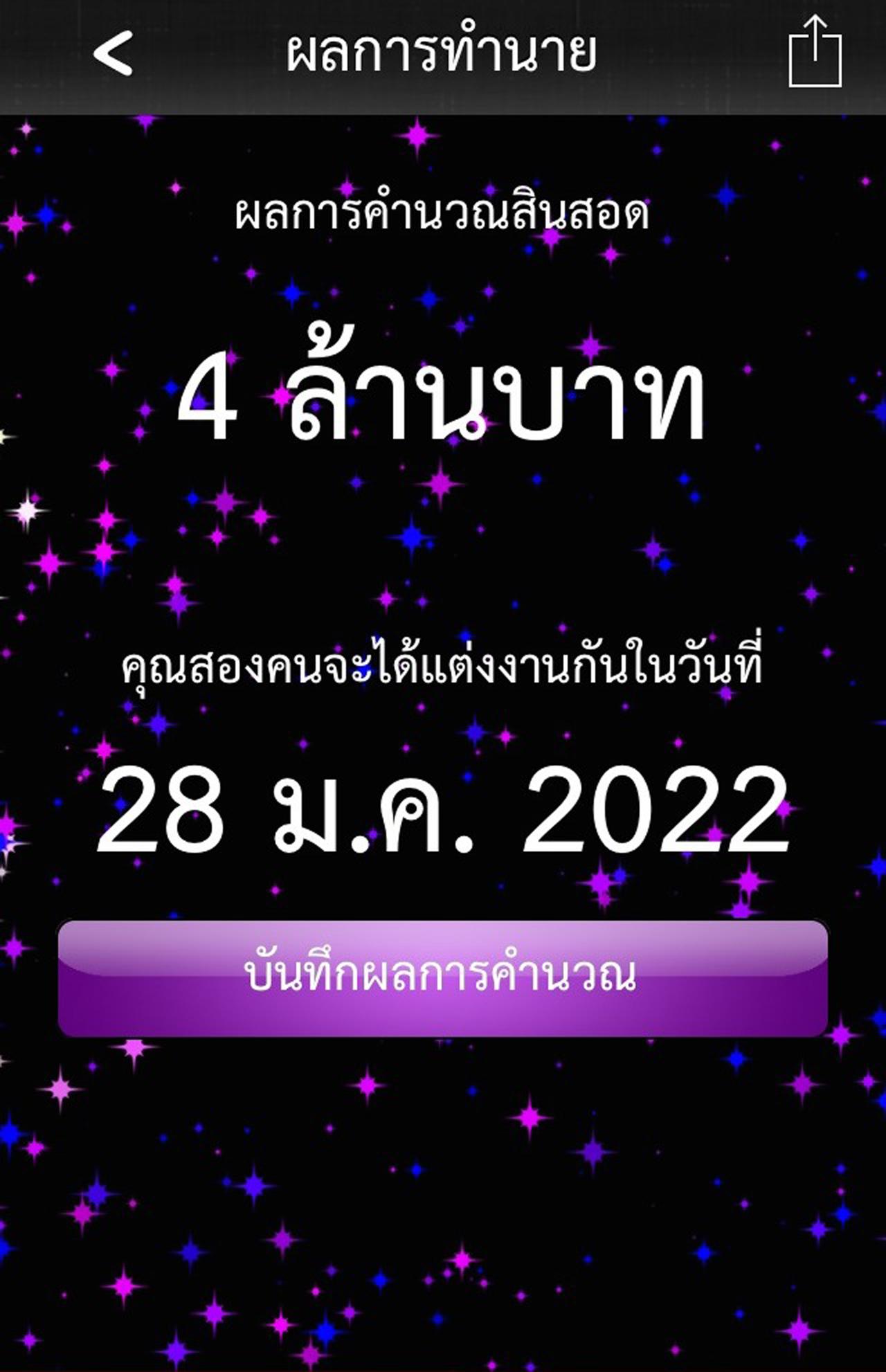 หลังจากคำนวณเสร็จแล้ว เรายังสามารถบันทึกประวัติการคำนวณเก็บไว้ หรือสาวๆ จะเลือกกดแชร์ให้ฝ่ายชายก็ได้ เป็นการบอกกลายๆ ว่า อย่าลืมเก็บเงิน แล้วมาสู่ขอฉันด้วยล่ะ!