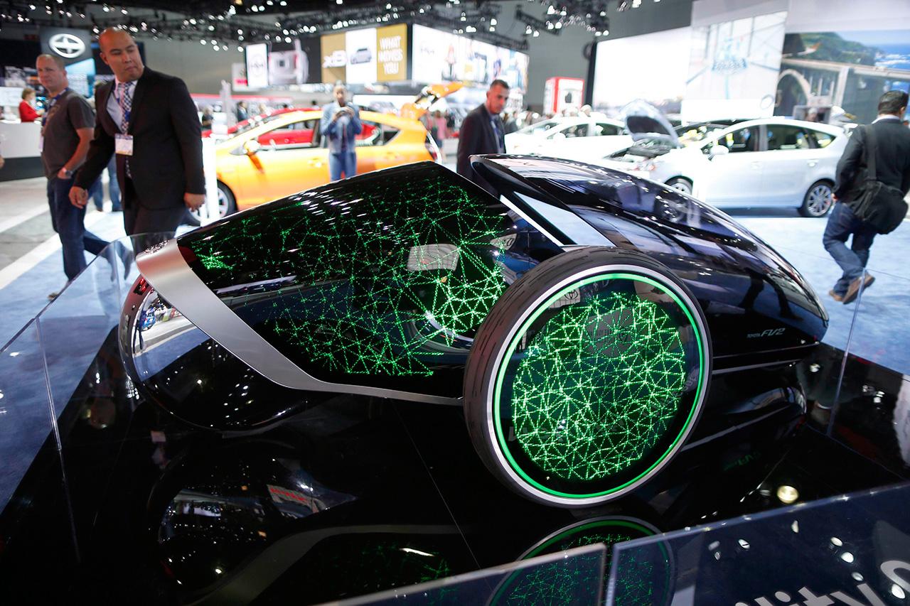 ผู้ชมงานแสดงรถยนต์ ลอสแอนเจลิส รัฐแคลิฟอร์เนีย ชมรถยนต์โตโยต้า ฟิวเจอร์ ที่สร้างขึ้นตามแนวความคิด ตั้งแสดงอยู่ในงาน.