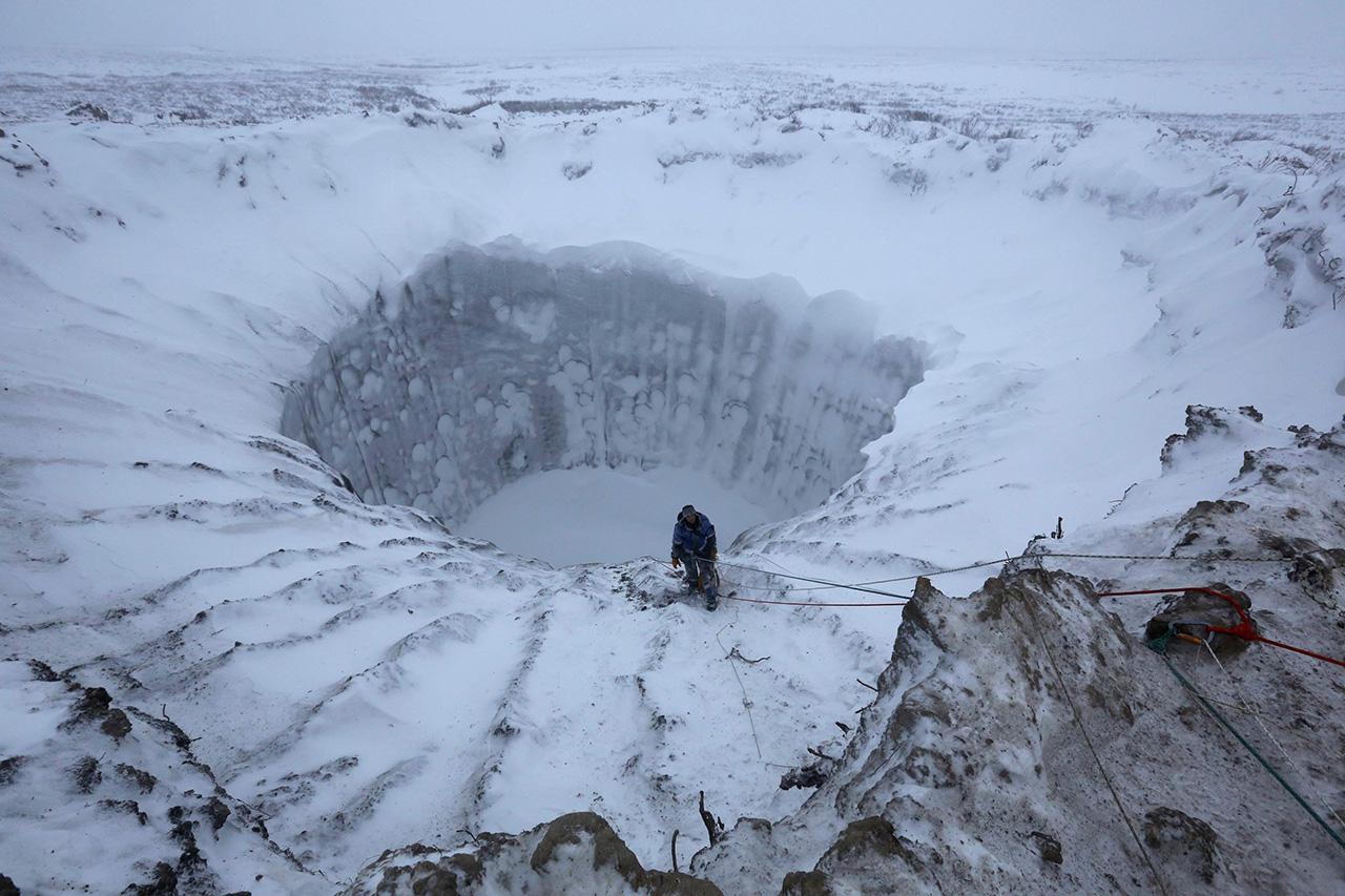 คณะนักสำรวจรัสเซีย ยืนตะลึงดูบนปากขอบหลุมบ่อ ที่เพิ่งเกิดขึ้นใหม่ๆ ที่คาบสมุทรยามัล ทางเหนือของไซบีเรีย เมื่อต้นเดือนนี้ หลังจากได้รับรายงานจากนักบิน ซึ่งถ่ายภาพวีดิโอไว้ได้ สมาชิกในคณะพยายามตะเกียก ตะกายลงไปในหลุมลงไปถึง 16 เมตร จนถึงก้นหลุมที่เป็นน้ำแข็ง แต่ทั้งคณะยังไม่อาจตกลงกันได้ว่า มันเกิดขึ้นได้อย่างไร.