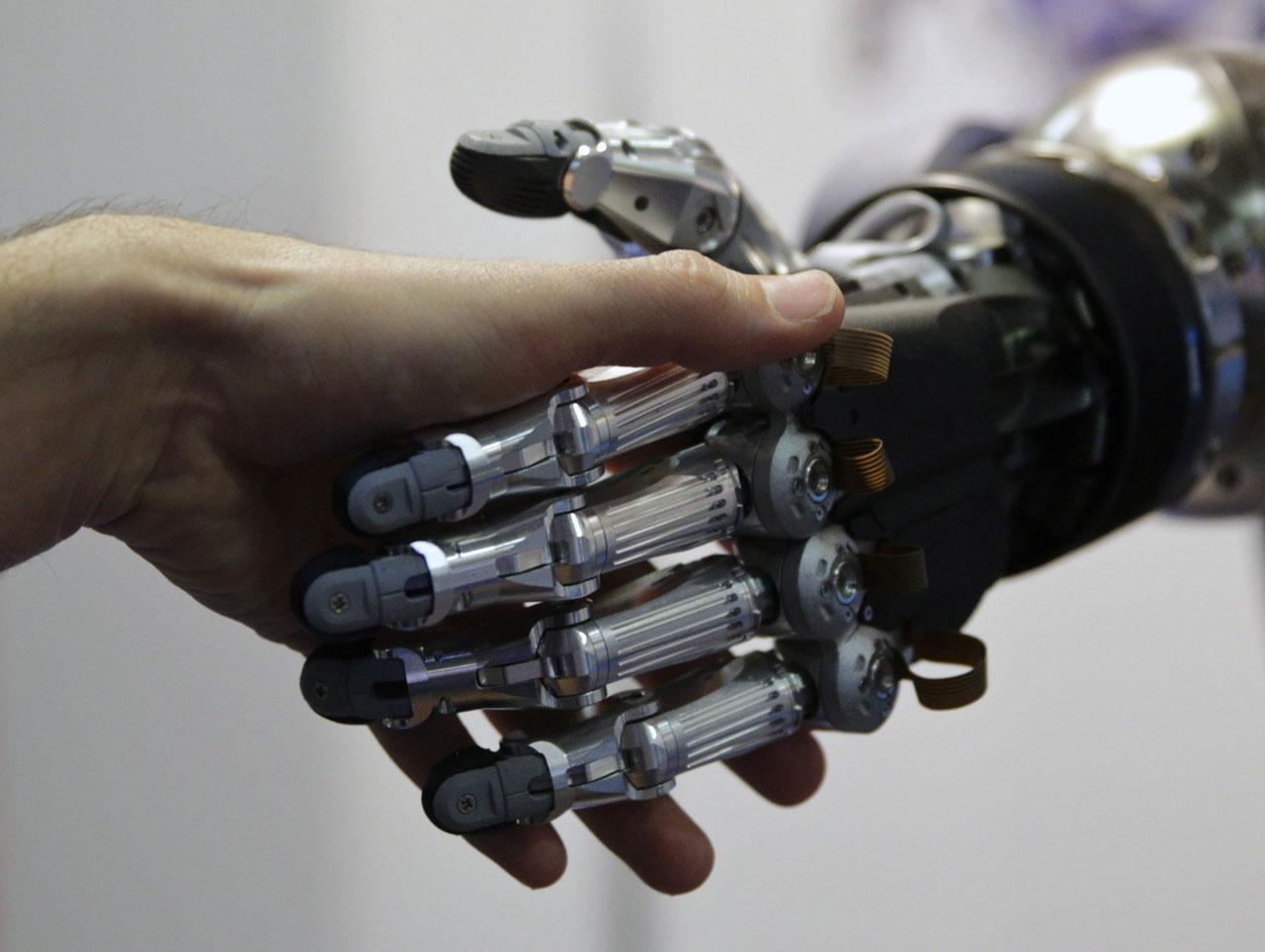 ผู้ชายคนหนึ่งยื่นมือจับกับมือของหุ่นยนต์มนุษย์ ที่งานประชุมเรื่องหุ่นยนต์มนุษย์ ในกรุงมาดริด ประเทศสเปน.