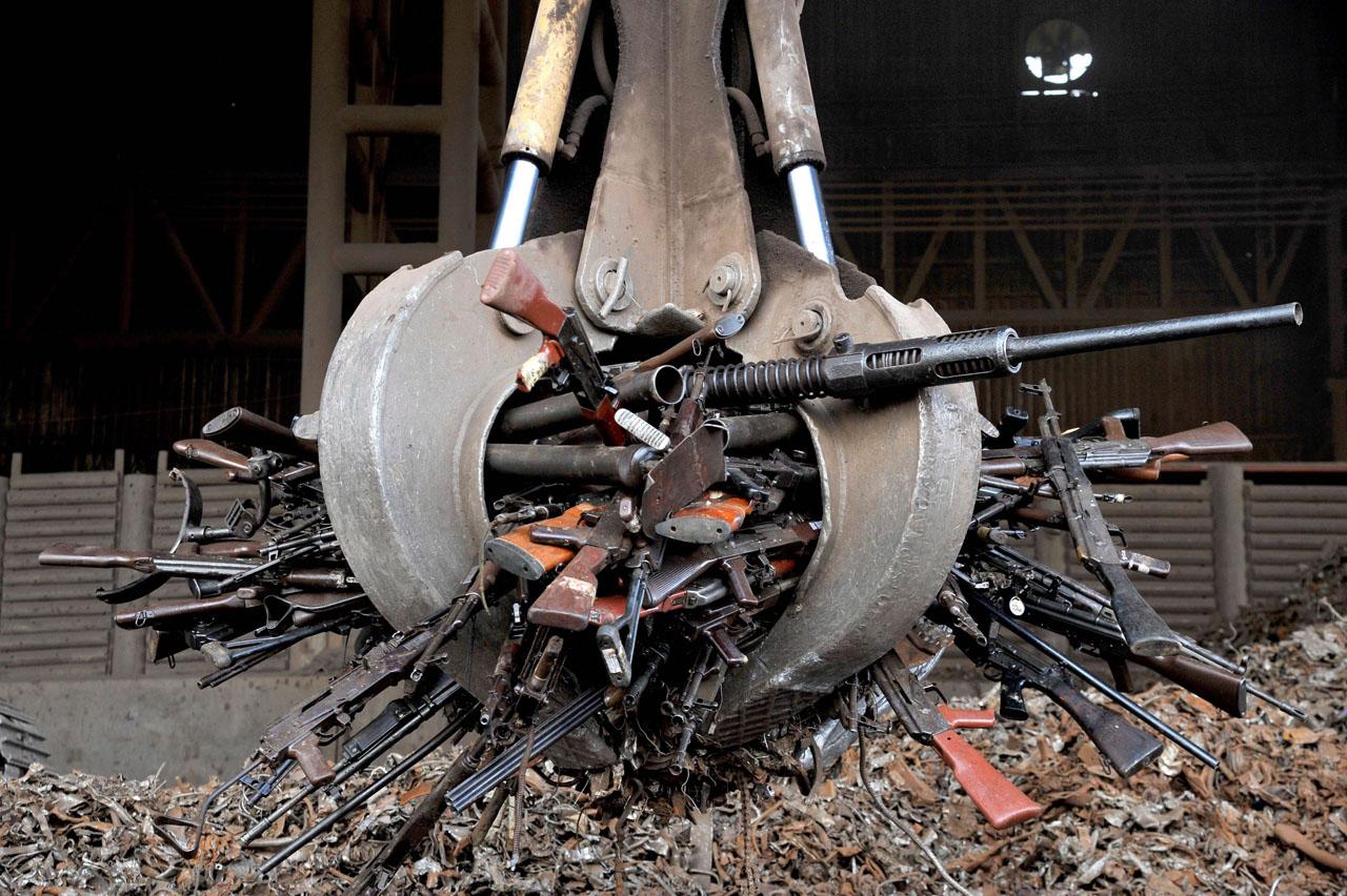 รัฐบาลโคลอมเบียต้องใช้รถปั้นจั่นมากวาดเก็บอาวุธปืน ที่ยึดมาได้จากพวกกองโจร และกลุ่มพวกก่อการร้ายต่างๆที่มาก่อเหตุ เอาไปเข้าโรงหลอมเหล็กของรัฐบาล เพื่อหลอมเอาเหล็กมาใช้ทำเหล็กเส้น ทำรากฐานและเสาของโรงเรียนและโรงพยาบาล ในอาณาบริเวณที่ยังมีการต่อสู้กับพวกโจรอยู่.