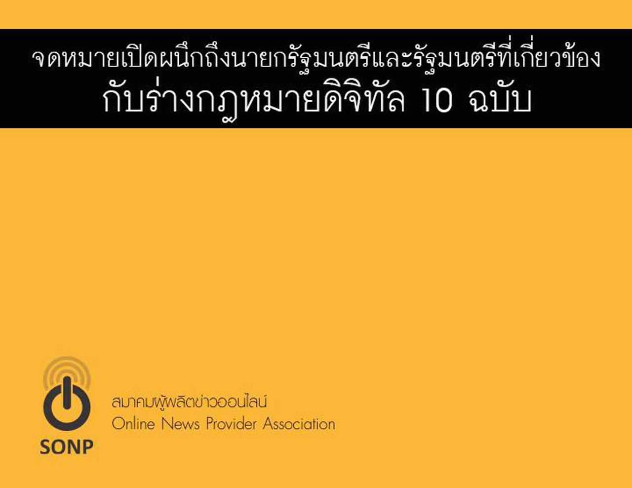 วันที่ 22 ม.ค. ผู้สื่อข่าวรายงานว่า สมาคมผู้ผลิตข่าวออนไลน์ ได้ยื่นจดหมายเปิดผนึกถึง พล.อ.ประยุทธ์ จันทร์โอชา นายกรัฐมนตรี และรัฐมนตรีที่เกี่ยวข้อง โดยเนื้อหาภายในจดหมายระบุถึงข้อห่วงใยต่อ ร่างกฎหมายดิจิทัล 10 ฉบับ ตามที่คณะรัฐมนตรี (ครม.) มีมติอนุมัติหลักการร่างกฎหมายใหม่ที่เกี่ยวข้องกับอุตสาหกรรมไอทีและอินเทอร์เน็ตจำนวน 10 ฉบับ ภายใต้แนวคิดการส่งเสริมเศรษฐกิจดิจิทัลของประเทศไทย