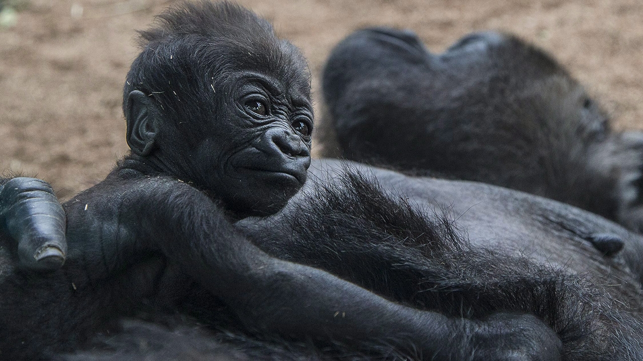 แม่ลิงกอริลลานอนอยู่กับลูก อายุ 1 เดือนของมัน ในสวนสัตว์ซาน ไดโก ที่สหรัฐอเมริกา ร่วมฝูงอยู่กับลิงกอริลลาอีกหลายตัวในฝูง.