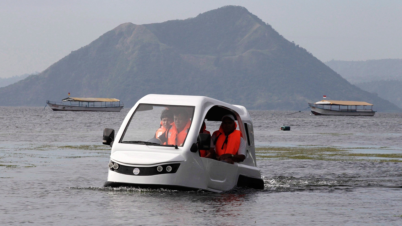 ช่างทดลองขับยาน 3 ล้อสะเทินน้ำสะเทินบก ในทะเลสาบรอบภูเขาไฟทาอัล ในฟิลิปปินส์ ยานมีชื่อว่า “ซาลามานเดอร์” ต่อในประเทศ ใช้เครื่องยนต์น้ำมันเบนซิน แล่นได้ทั้งในน้ำและบนบก เหมาะกับงานช่วยเหลือผู้ประสบภัย นั่งได้ 5 คน เสียค่าใช้จ่ายประมาณคันละ 148,500 บาท.