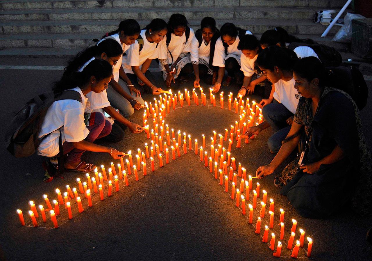 ทั้งลูกศิษย์และอาจารย์วิทยาลัยเภสัชกรรม ที่เมืองบังกะลอร์ ของอินเดีย ร่วมชุมนุมกันจุดเทียน เนื่องในวันเตือนอันตรายของโรคมะเร็ง เมื่อต้นเดือนนี้.