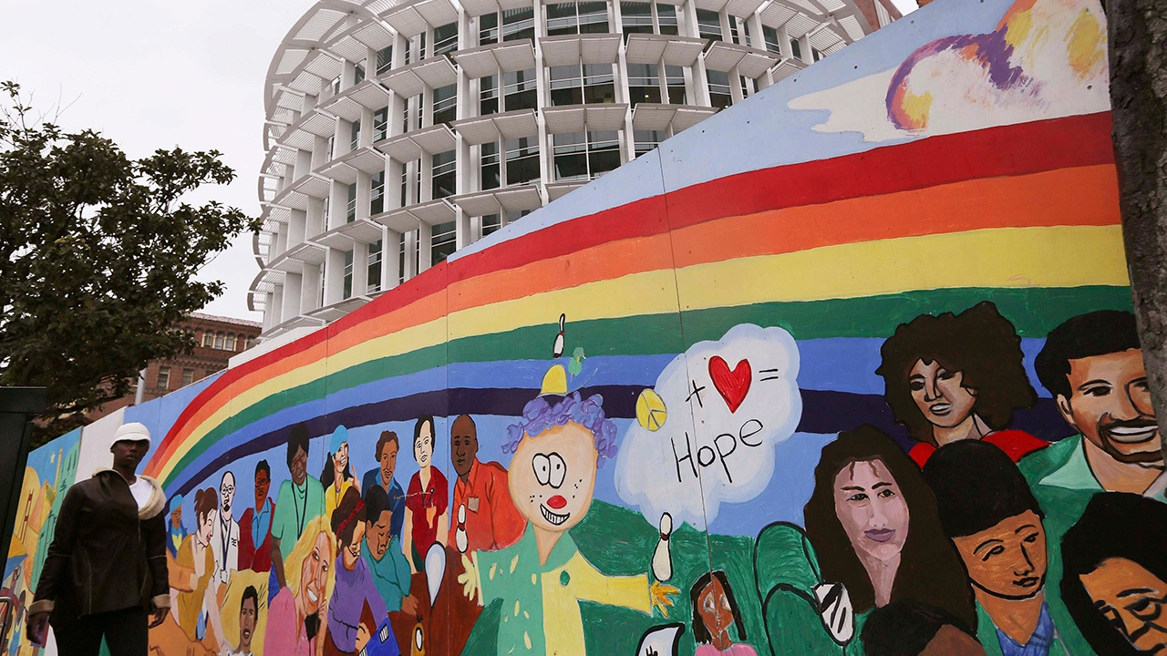 ผู้คนเดินผ่านภาพวาดหน้าโรงพยาบาลกลางซานฟรานซิสโก ในแคลิฟอร์เนีย โรงพยาบาลแห่งใหม่ที่สร้างขึ้น ด้วยทุนอุดหนุนจากนายมาร์ค ซัคเกอร์เบิร์ก ซีอีโอของเฟซบุ๊กกับภริยา จำนวน 2,475 ล้านบาท กำหนดเปิดดำเนินงานตอนปลายปีนี้.