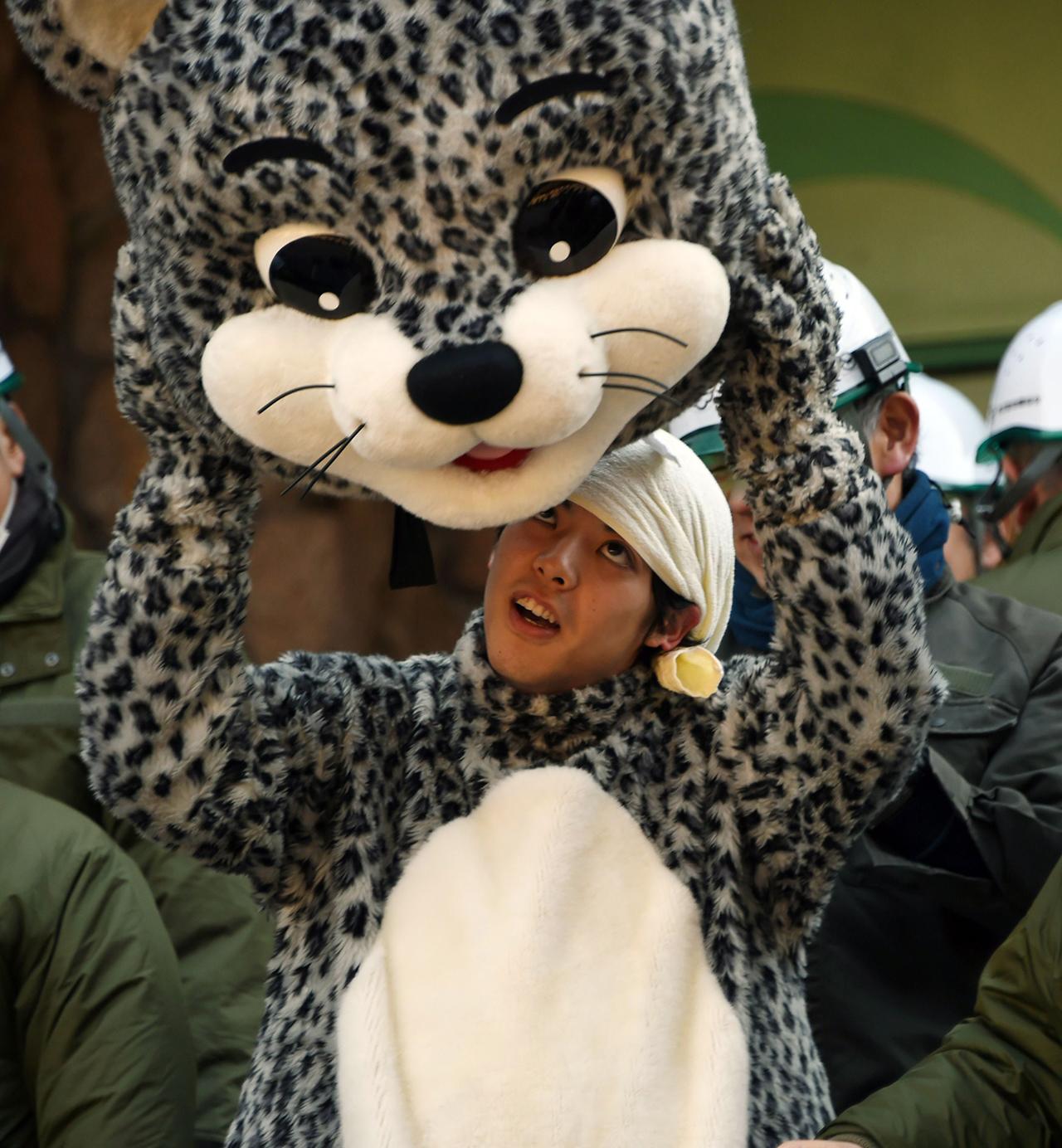 พนักงานสวนสัตว์ทามา ทางชานกรุงด้านตะวันตกของกรุงโตเกียว ถอดหุ่นเสือดาวหิมะออก หลังจากเสร็จการซ้อมฝึก หากเกิดมีสัตว์หนีหลุดจากสวนสัตว์ เป็นการซ้อมที่ปฏิบัติกันอยู่เป็นประจำทุกปี.