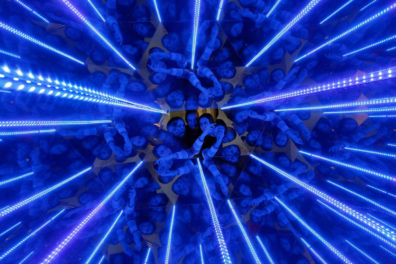 สตรีชาวรัสเซีย 3 คน จ้องมองดูกล้องรูปภาพหลากสี ที่ “สวนนิวตัน” ในงานแสดง เนื่องในวันวิทยาศาสตร์ของรัสเซีย ที่เมืองกราสโน ยาร์สก์ แคว้นไซบีเรีย.