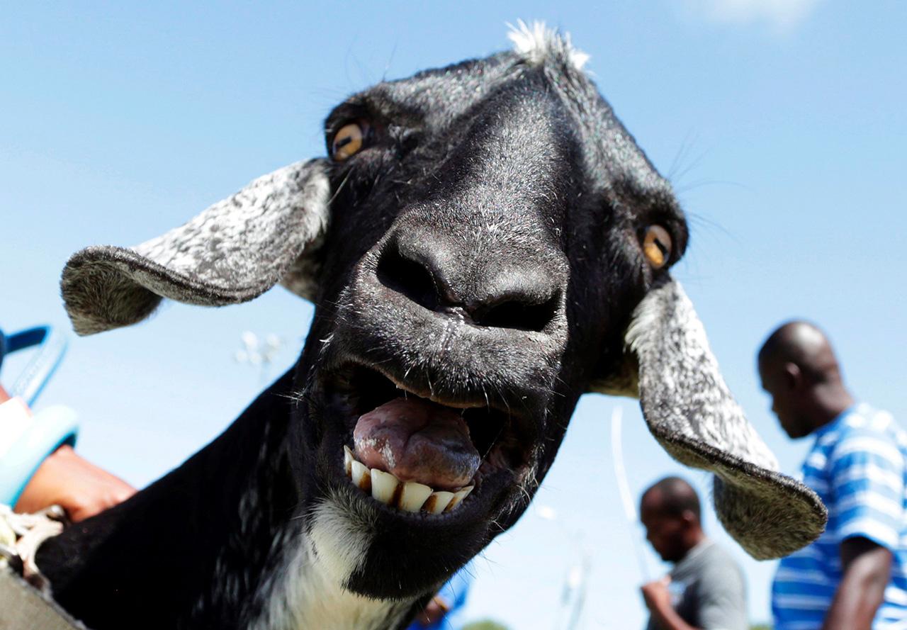 แพะตัวหัวโจกร้องอย่างคึกคักขณะเดินตามขบวนไปร่วมงานเทศกาลอีสเตอร์ ประจำปี ที่สถานตากอากาศเมาท์ พลีแซนต์ ที่เมืองโตเบโก.