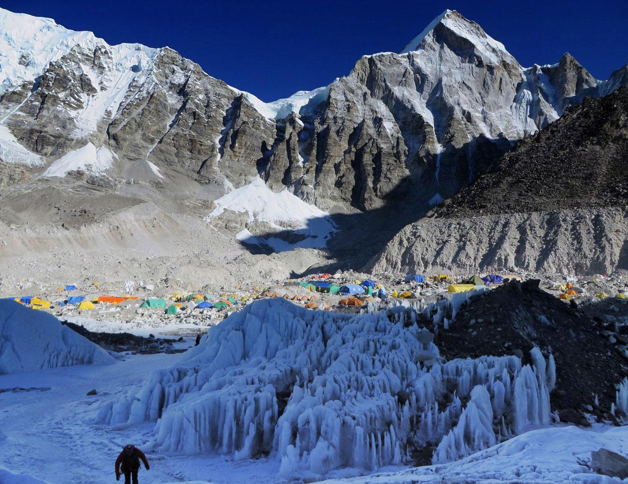 ภาพถ่ายยอดเขาเอเวอเรสต์ ถ่ายจากแครมปอน พอยต์ ปากทางเข้าน้ำตกที่เป็นน้ำแข็งคำภู ซึ่งเคยหิมะถล่มคร่าชีวิตไกด์ชาวเชอร์ปาส์ไปถึง 16 คน ปีกลาย แต่ที่เมืองลูคลา บนเขาหิมาลัย ชาวเมืองยังหวั่นวิตกกันอยู่ เมื่อมีนักไต่เขาจะยกพวกกลับไปไต่เขาอีก ถึงกับทางการได้ห้ามการไต่ยอดเขาทางด้านนี้เอาไว้ชั่วคราว.