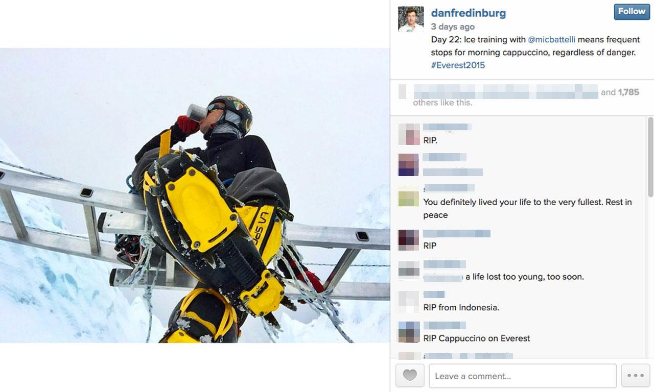 6. ก่อนหน้านั้นเพียง 1 วัน เขาได้โพสต์ภาพและข้อความผ่านอินสตาแกรมส่วนตัว โดยระบุว่าเป็นวันที่ 22 ของการปีนภูเขาน้ำแข็ง พร้อมติดแฮชแท็ก #Everest2015