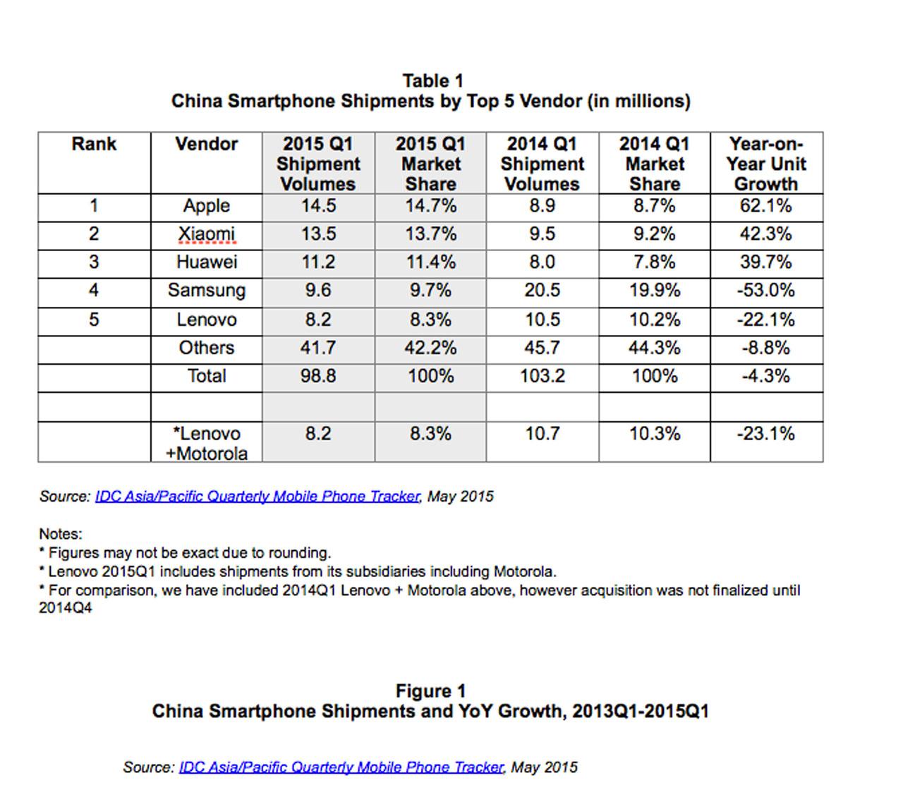 แอปเปิล (Apple) ยังคงเป็นผู้นำในตลาดสมาร์ทโฟนประเทศจีน ในไตรมาสที่ 1 ปี 2015 โดยที่มีเสี่ยวมี่ (Xiaomi) ตกลงมาเป็นอันดับที่ 2 ตามด้วย หัวเว่ย ซัมซุง และเลอโนโว ตามลำดับ โดยแอปเปิลเป็นผู้ผลิตสมาร์ทโฟนรายใหญ่ในจีน ที่ทำยอดขายสูง ที่สามารถเอาใจผู้ใช้งานด้วยสมาร์ทโฟนจอใหญ่อย่าง ไอโฟน 6 และไอโฟน 6 พลัส ขณะที่ เสี่ยวมี่ ตกลงมาเป็นที่ 2 จากการต้องแข่งขันอย่างหนักจากคู่แข่งในตลาดระดับกลางถึงล่าง ขณะที่ หัวเว่ย ยังคงรักษาอันดับไว้อย่างเหนียวแน่นด้วยการทำตลาดระดับกลางได้ดี ส่วน ซัมซุง และ เลอโนโว ที่เคยเป็นผู้นำเมื่อช่วงปลายปีก่อน ร่วงลงมาอย่างรวดเร็ว โดยมีไฮไลต์ที่น่าสนใจมาจากการที่เกิดความผันผวน ในเรื่องค่ายนิยมแบรนด์ของชาวจีน