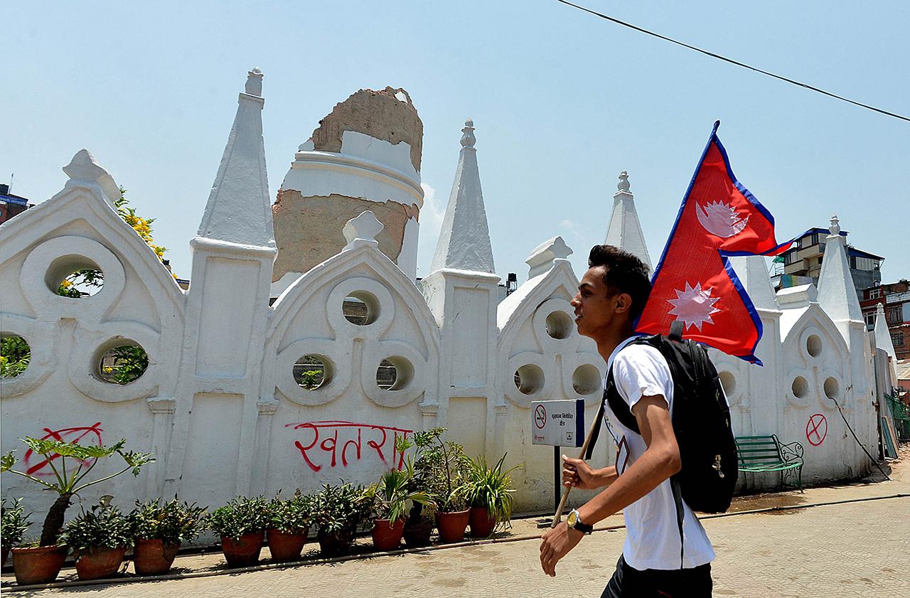 ชาวเนปาลคนหนึ่งแบกธงชาติ เดินผ่านซากปรักหักพังของหอยคอยดาราฮารา ในกรุงกาฐมาณฑุ เมื่อวันจันทร์ที่แล้ว ในขณะครบรอบแผ่นดินไหวมหาวิปโยค 1 เดือน.