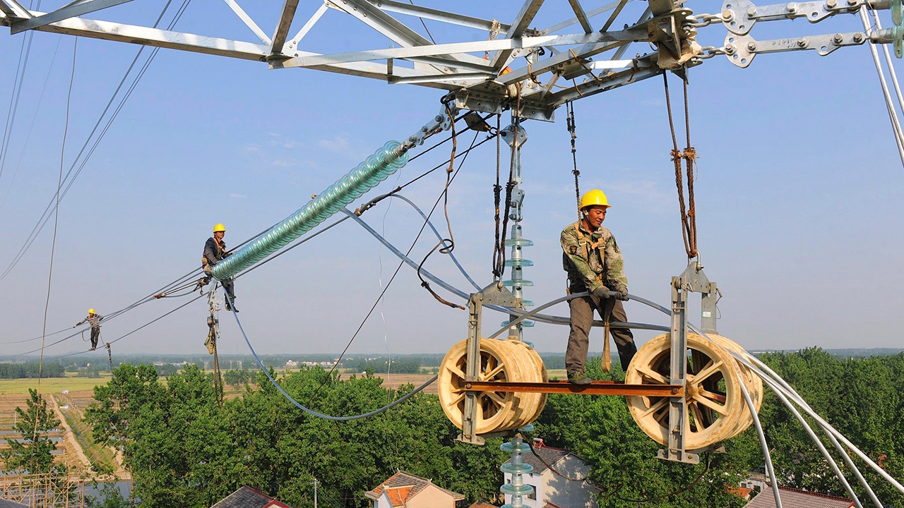 คนงานเดิน สายไฟฟ้าบนเสาไฟฟ้าแรงสูง ในมณฑลอานฮุย ของจีน หลังจากที่สำนักวางผังเมืองของจีน เพิ่งประกาศรายการก่อสร้างโครงการใหม่อีก 1,000 โครงการ โดยเรียกร้องให้เอกชน เข้ามาร่วมลงทุน.