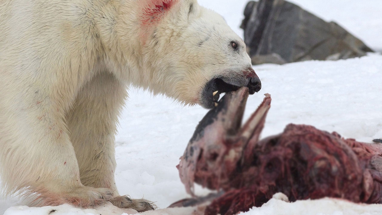 หมีขาวขั้วโลกกำลังกัดกินจะงอยปากโลมา บนเกาะน้ำแข็ง ในเขตหมู่เกาะของนอร์เวย์ ยามใดที่ อากาศดีขึ้น จะเห็นหมีขั้วโลกออกมาหาอาหารแปลกๆ กิน.