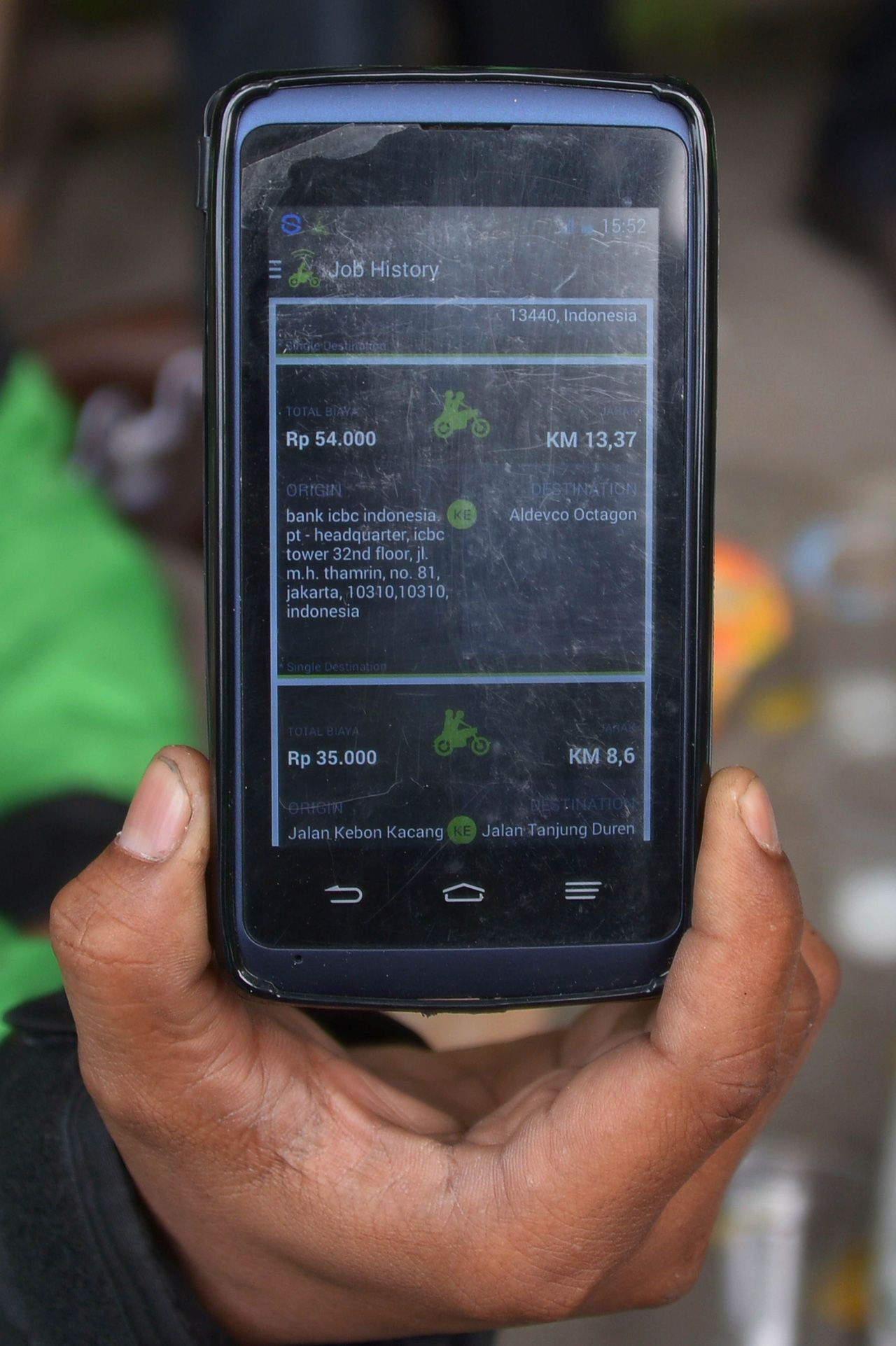พลมอเตอร์ไซค์อินโดนีเซีย ที่กรุงจาการ์ตา อวดโปรแกรมนำทาง ใช้กับโทรศัพท์มือถือ นำทางให้พลมอเตอร์ไซค์ซอกซอนไปตามทางเล็กคดเคี้ยว ไปสู่ที่หมายได้โดยเร็ว พลมอเตอร์ไซค์ในชุดแจ็กเกตสีเขียวและหมวกกันน็อกได้อาศัยมันในการประกอบอาชีพทุกวัน.