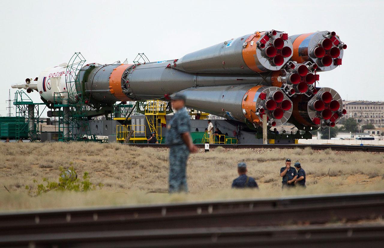 ตำรวจรัสเซียรักษาการณ์ ขณะที่ยานอวกาศ “โซยูซ-17 เอ็ม” ถูกขนไปยังฐานส่งจรวด ที่คอสโมโดรม ไบโคนูร์ คาซัคสถาน เพื่อใช้ส่งทีมมนุษย์อวกาศชุดใหม่ ขึ้นไปประจำบนสถานีอวกาศระหว่างประเทศ ในวันที่ 23 ก.ค.ศกนี้.