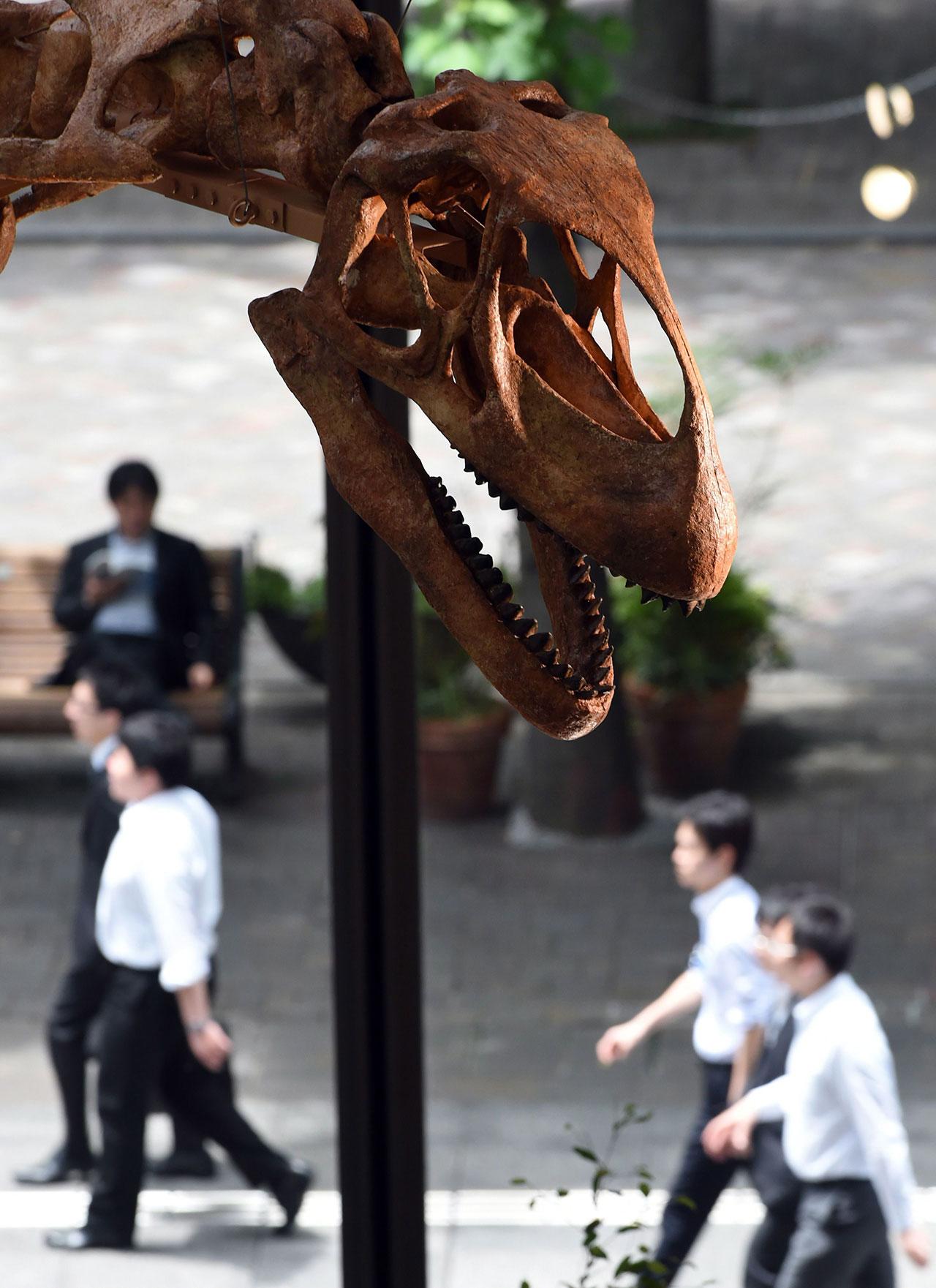 พนักงานช่วยกันยกหุ่นจำลองตัวอย่างของกะโหลกศีรษะไดโนเสาร์ยาว 9 เมตร ขึ้นไปไว้บนยอดเสา หน้าทางเข้าช็อปปิ้งมอลล์แห่งหนึ่งทางย่านกลางกรุงโตเกียว ซึ่งกำลังจะเปิดงาน “งานแสดงเมกะไดโนเสาร์ 2015” อยู่พอดี.