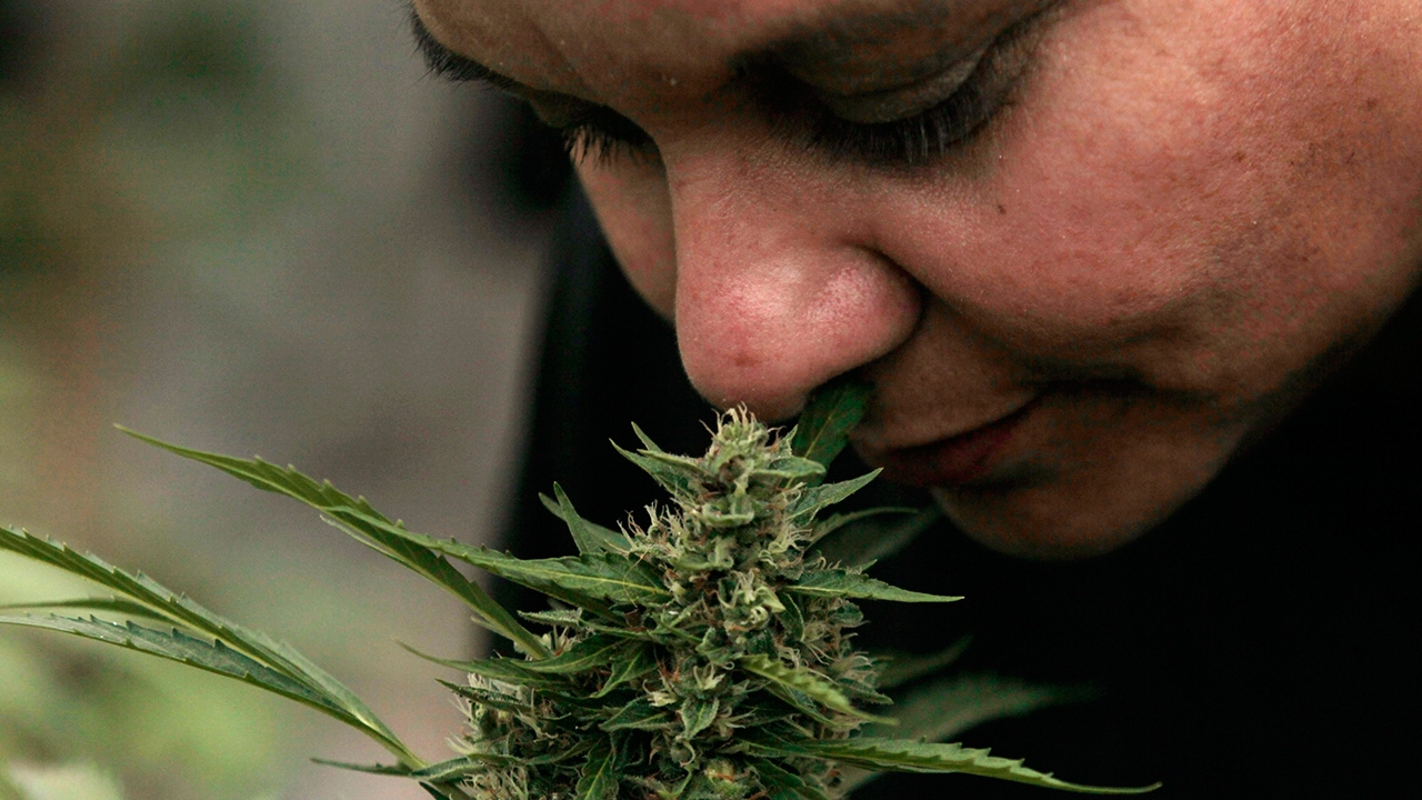 ผู้ป่วยหญิงด้วยโรคแพ้ภูมิตนเองกับมะเร็งเต้านมดมใบกัญชา ในการแถลงข่าว ที่องค์การเทศบาล ในกรุงซานเตียโก ประเทศชิลี ตามกฎหมายของชิลีอนุญาตให้ใช้กัญชาในการรักษาโรคได้.