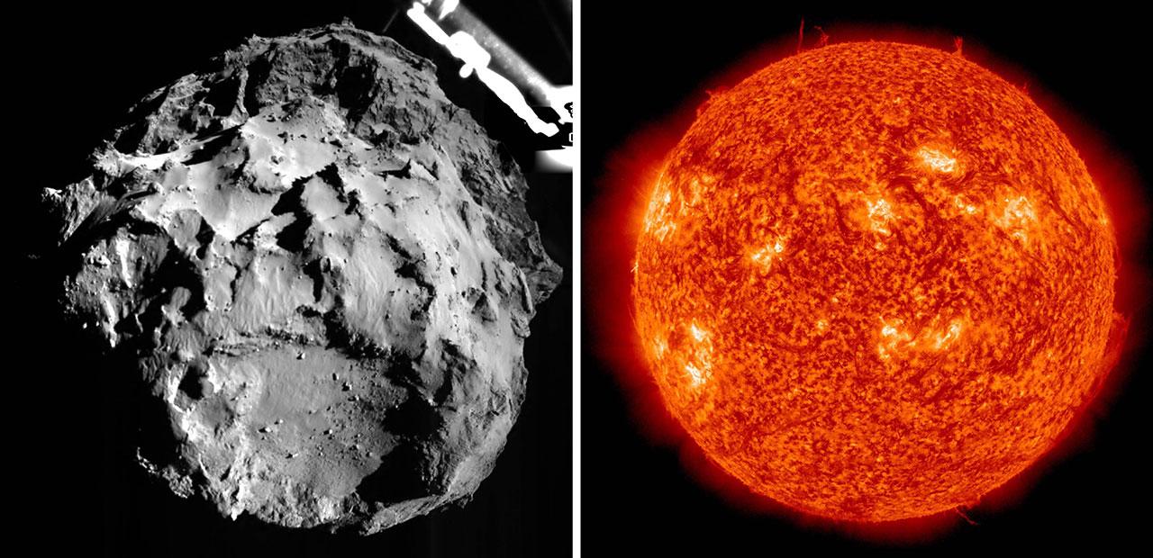 องค์การอวกาศสหรัฐฯเปิดเผยภาพที่ได้เก็บไว้ อันเป็นภาพพื้นผิวของดาวหาง “จุรีมอฟเอรัสซิเมนโก” ถ่ายจากยานอวกาศ “ฟิแล แลนเดอร์” (ซ้าย) ขณะที่ถูกปล่อยลงจอดบนดาวหาง ในระยะห่างจากพื้นเพียง 3 กม. ส่วนภาพ (ขวา) เป็นภาพของดวงอาทิตย์.