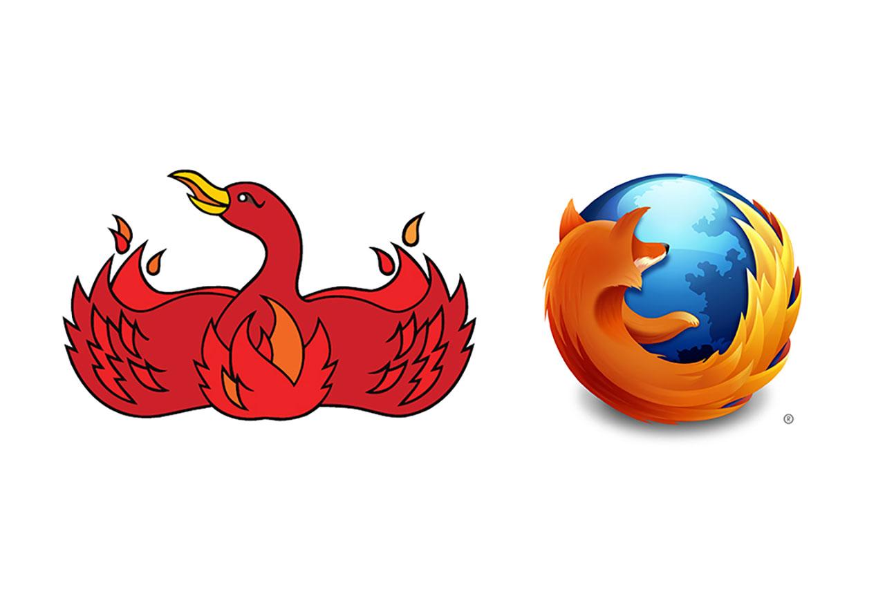 ก่อนที่จะรีแบรนด์ใช้ชื่อ Firefox ซึ่งหมายถึงแพนด้าแดงในภาษาจีน พร้อมเปลี่ยนโลโก้นับตั้งแต่ปี 2004 ในช่วงสองปีแรก (2002-2004) ที่เปิดใช้บริการ เบราว์เซอร์เจ้านี้ใช้ชื่อว่า Mozilla Phoenix and Firebird ซึ่งมาพร้อมโลโก้ที่ไม่อ้อมค้อมแต่อย่างใด