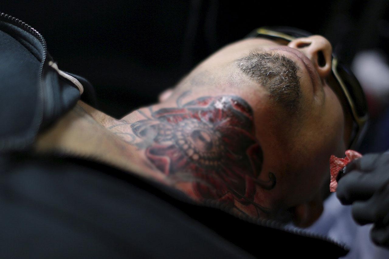 ผู้นิยมการสักที่ปานามาคนหนึ่ง นอนหงายคอให้ช่างสัก ในงานมหกรรมสัก ที่นครปานามาซิตี้ ประจำปี.