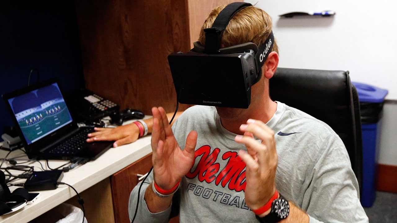 นักฟุตบอลอเมริกันผู้หนึ่ง ใช้กล้องมองเสมือนจริงและไมโครโฟน เพื่อศึกษาแผนการเล่น ที่ศูนย์กีฬาแมนนิ่ง ในเมืองออกซ์ฟอร์ด รัฐมิสซิสซิปปี้.