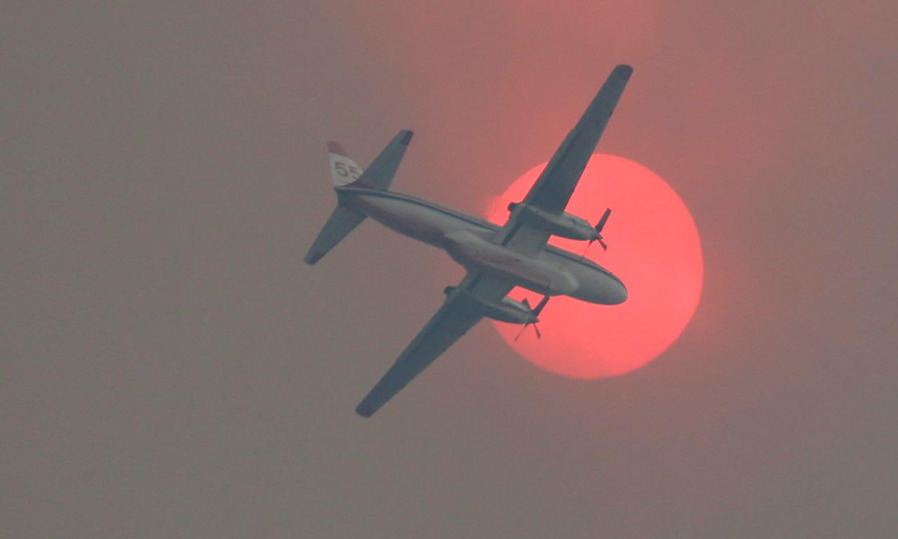 เครื่องบินดับเพลิง บินผ่านดวงอาทิตย์เบื้องบน ฝ่ากลุ่มควันจากไฟไหม้ป่า ใกล้กับเมืองทวิสป รัฐวอชิงตัน สหรัฐฯ เลยกลายเป็นสีส้มทั้งลำ.