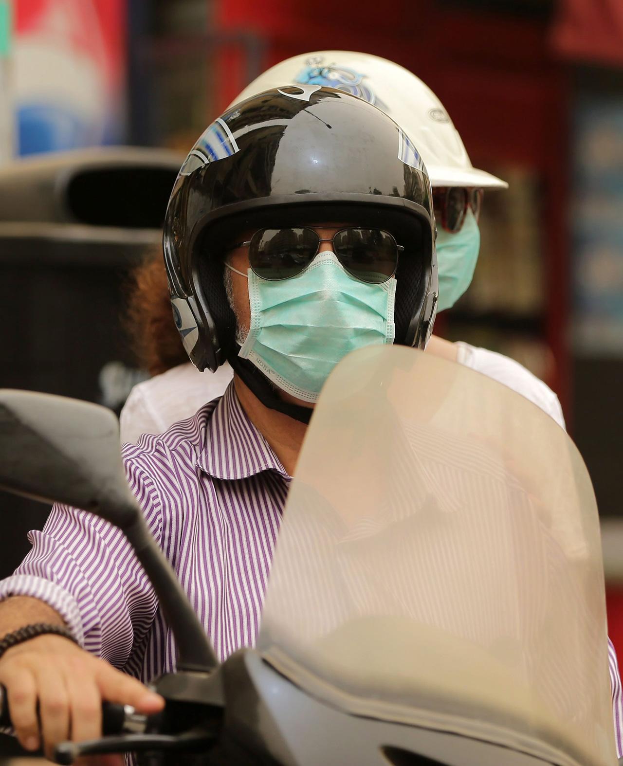 ชาวเลบานอนที่ใช้รถสกู๊ตเตอร์ ต้องพากันสวมหน้ากากป้องกันพายุทรายอย่างรัดกุม เมื่อวิ่งอยู่ในย่านธุรกิจของกรุงเบรุต แม้กระนั้นยังมีผู้เสียชีวิต 2 ราย ป่วยอีก 750 ราย.