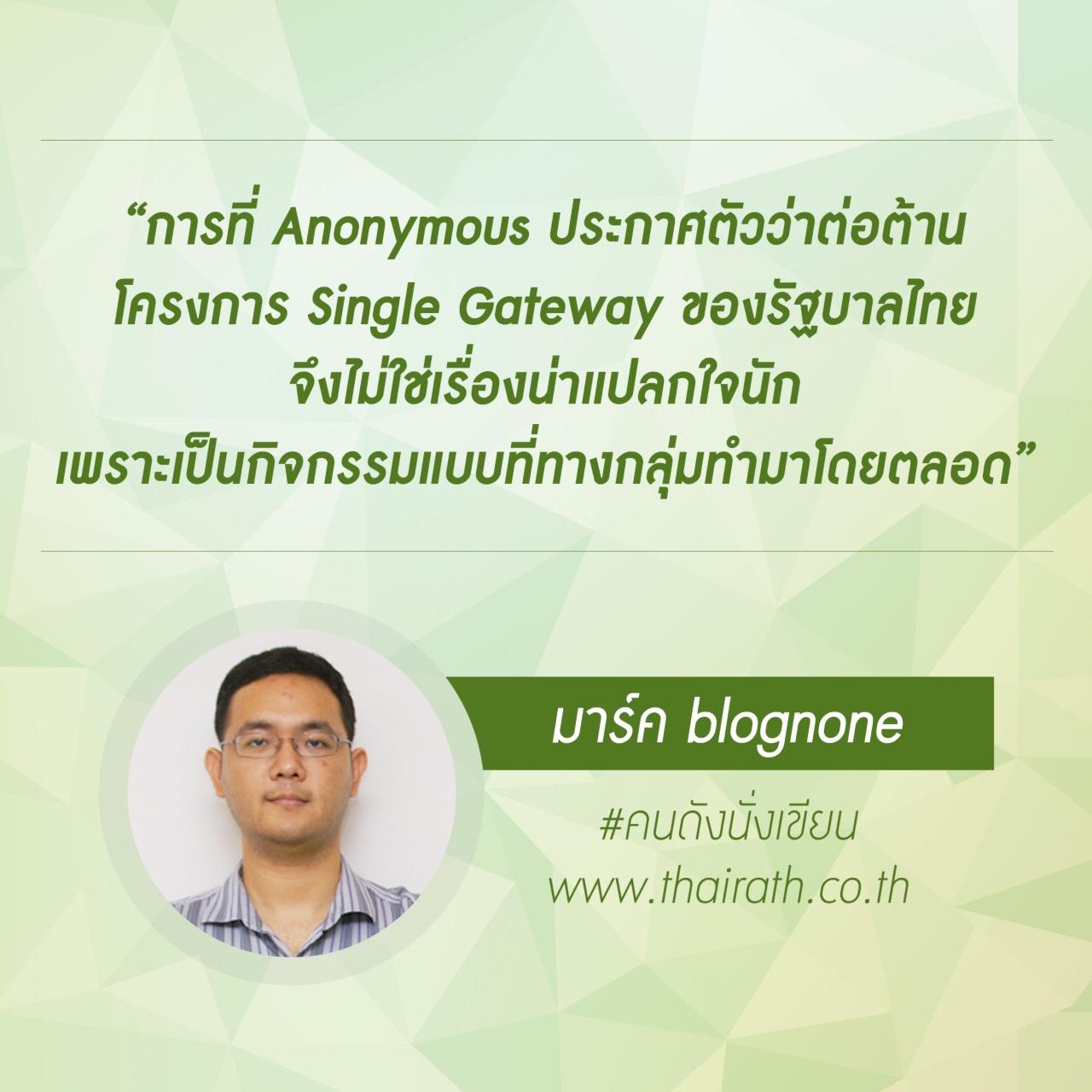 การที่ Anonymous ประกาศตัวว่าต่อต้านโครงการ Single Gateway ของรัฐบาลไทย จึงไม่ใช่เรื่องน่าแปลกใจนัก เพราะเป็นกิจกรรมแบบที่ทางกลุ่มทำมาโดยตลอด