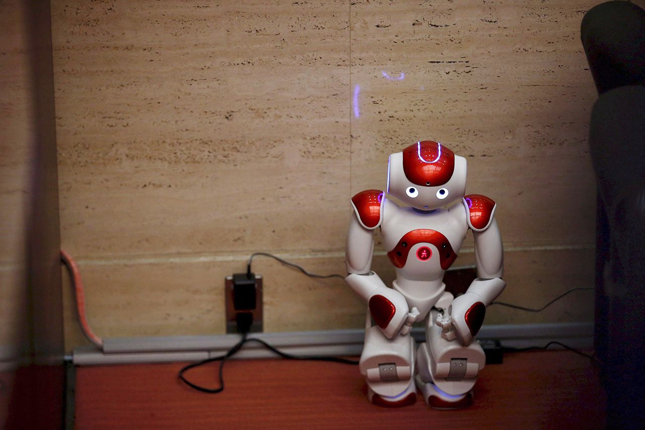 “นาโอะ” หุ่นยนต์รูปทรงมนุษย์ โดนจับไปนั่งอยู่ที่มุมห้องที่หนึ่งเพื่อชาร์จไฟ หลังจากถูกนำออกแสดงที่สาขาของธนาคารโตเกียวมิตซูบิชิ ในกรุงโตเกียว.