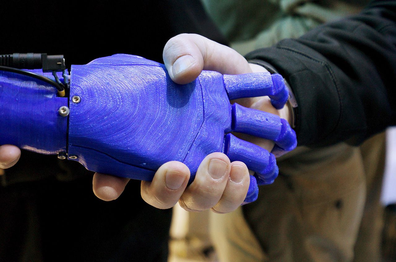 ผู้มาเที่ยวในงานแสดงสินค้าอิเล็กทรอนิกส์ผู้บริโภคสากล นครลาสเวกัส ของอเมริกา จับมือกับมือปลอมของหุ่นยนต์ ที่ร้านของบริษัทอินเทล.