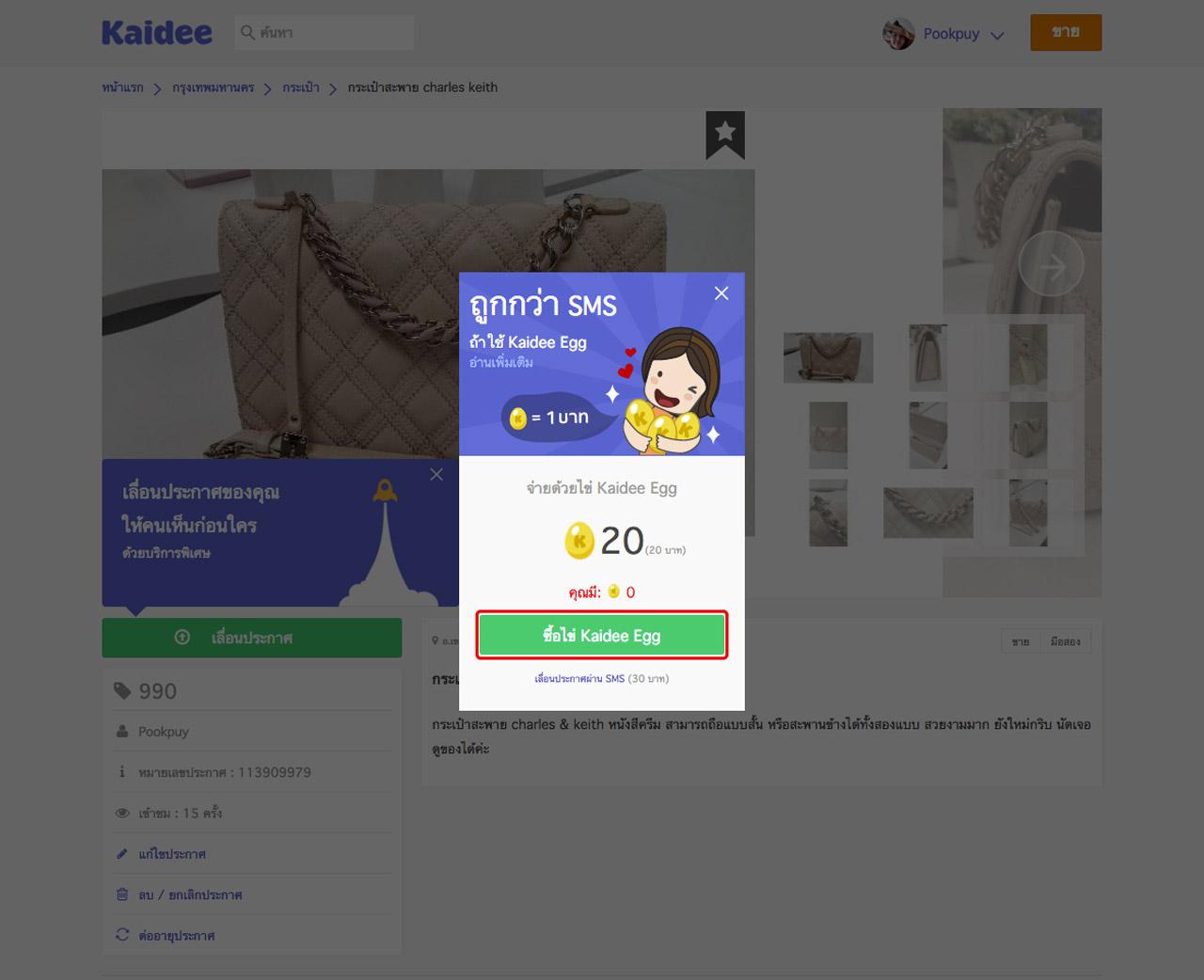 ทั้งนี้ ข้อดีของการเลื่อนประกาศด้วยวิธีชำระค่าบริการพิเศษจากไข่ Kaidee Egg คือ 1. ถูกลง จากการใช้ไข่ดังกล่าวในการชำระค่าบริการพิเศษ เนื่องจากราคาจะถูกกว่าการชำระผ่านเอสเอ็มเอส ทั้งยังเลือกได้ตามความต้องการ ด้วยแพ็กเกจที่มีให้เลือกตั้งแต่ 50 เอ้ก ไปจนถึง 2,500 เอ้ก พร้อมโบนัสยิ่งซื้อเยอะยิ่งคุ้ม 2. ง่ายขึ้น ไม่ต้องคอยพิมพ์รหัสและส่งเอสเอ็มเอสทุกครั้ง โดยสามารถจ่ายด้วยบัตรเครดิตหรือบัตรเดบิตเพียงครั้งเดียว จากนั้นสามารถใช้ไข่ Kaidee Egg เพื่อเลื่อนประกาศหรือใช้บริการพิเศษอื่นๆ โดยไม่ต้องพิมพ์ จนกว่าไข่ในแพ็กเกจของคุณจะหมด 3. สุขยิ่งขึ้น จากโอกาสให้คนได้เห็นสินค้าของคุณก่อนใคร เรียกว่าเพิ่มความสุขในการขายที่คุณจัดการได้ด้วยตนเอง.