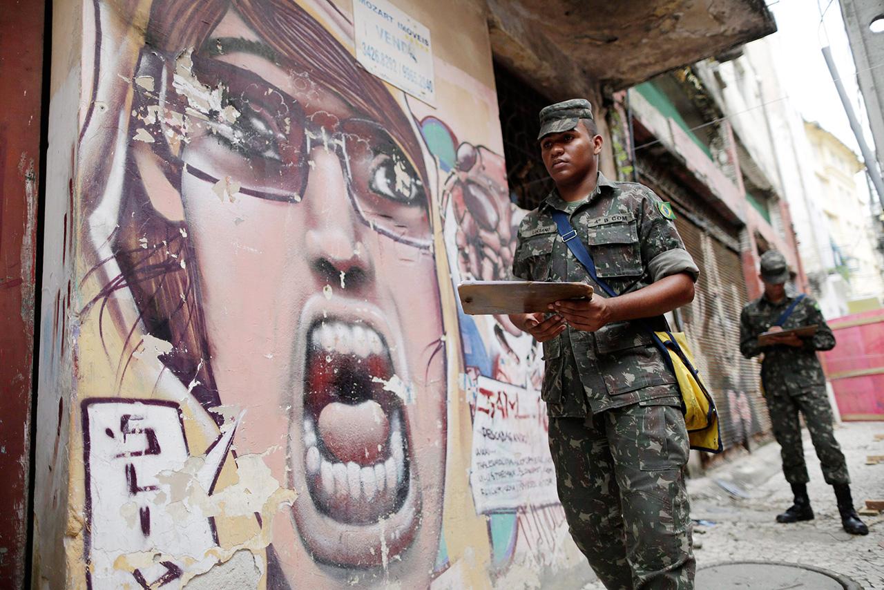 ทหารบราซิลยืนอ่านโปสเตอร์ให้ตระหนักถึงภัยของยุงลาย ปิดประกาศอยู่ในเมืองเรซิเฟ ประเทศบราซิล ชาวบราซิลขณะนี้พากันหวาดหวั่นการระบาดของโรคไวรัสซิกานี้มาก โดยเฉพาะที่มีข่าวว่าถึงกับทำให้หญิงท้องคลอดลูกออกมาไม่สมประกอบ.