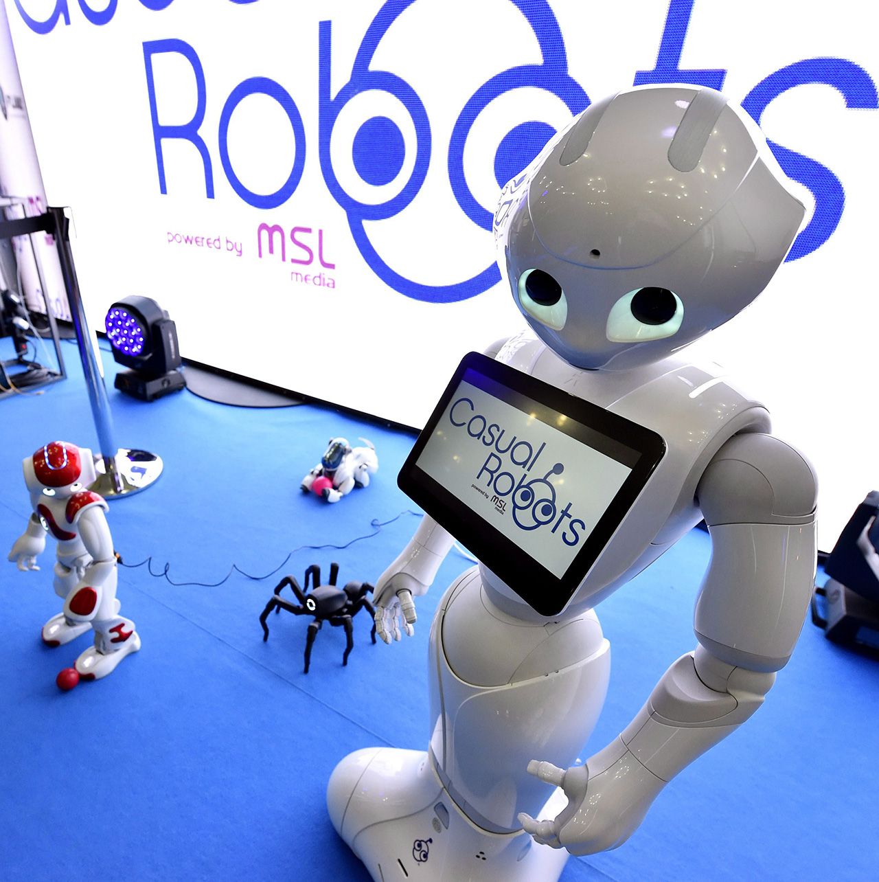 หุ่นยนต์เจ้าเปปเปอร์รุ่นใหม่ มีจออยู่ที่หน้าอก ของบริษัทหุ่นยนต์ฝรั่งเศสแห่งหนึ่ง อวดตัวเองในงานแสดงหุ่นยนต์ของโลก.