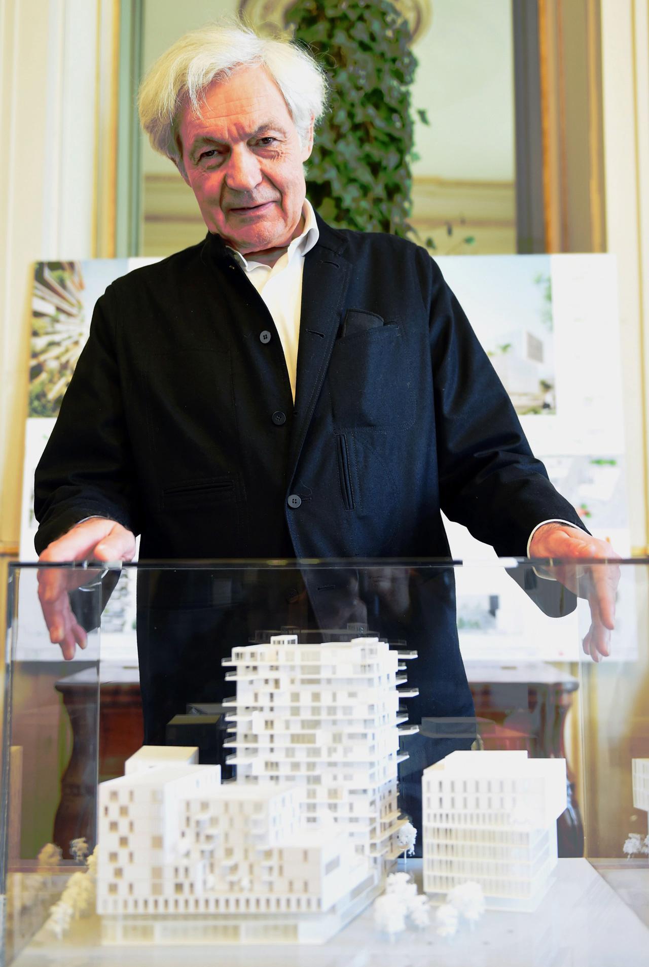 สถาปนิกฝรั่งเศส นายฌอง พอล วีกีเยร์ ผู้ชนะการประกวดออกแบบอาคาร ถ่ายรูปกับแบบจำลองหอคอยที่ได้รับรางวัลชนะเลิศ ในการประกวดที่เมืองบอร์กโดซ์ ประเทศฝรั่งเศส.