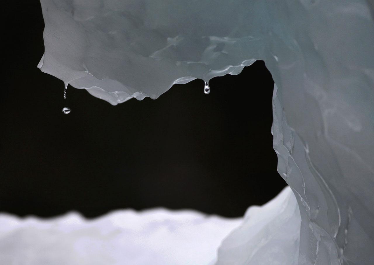 ภูเขาน้ำแข็งลอยอยู่ในทะเลใกล้เกาะเคอฮัคกักซัวว์ ดิสโกกรีนแลนด์ เพราะอุณหภูมิโลกที่ร้อนขึ้น ทำให้แกนโลกเอียงไป (รูปซ้าย) องค์การอวกาศได้แจ้งว่า ชั้นน้ำแข็งที่กำลังละลาย โดยเฉพาะในแถบกรีนแลนด์ น้ำหนักของโลกที่กระจายออกแปรเปลี่ยนไป เป็นเหตุให้ทั้งขั้วโลกเหนือแกว่ง(ภาพขวา) น้ำที่ละลายจากภูเขาน้ำแข็งใกล้ ของกรีนแลนด์ ละลายไหลออกมาเป็นสาย.