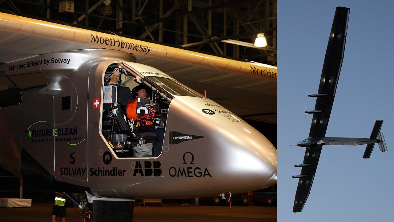 (ซ้าย) เครื่องบินพลังงานแสงแดด “โซลาอิมพัล 2” กำลังจะบินข้าม มหาสมุทรแปซิฟิก จากสนามบินคาเลอีโลเอ ออกเดินทางตาม (รูป ขวา) เพื่อไปยังแคลิฟอร์เนียเหนือของอเมริกา ใช้เวลานานถึง 2 วันครึ่ง.