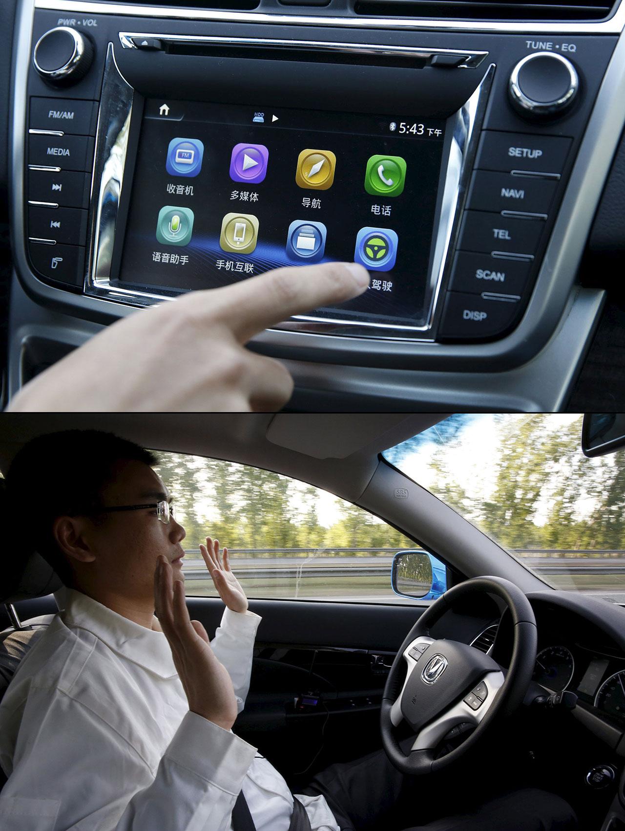 วิศวกรจีนนั่งอยู่ในรถยนต์ โดยชูมือเอาไว้ไม่ให้แตะพวงมาลัยเลยรถยนต์คันนี้ถูกสร้างให้ขับตัวเองได้ บนไฮเวย์สายหนึ่ง ที่กรุงปักกิ่ง เพียงแต่กดปุ่มให้มันทำงานเท่านั้น.