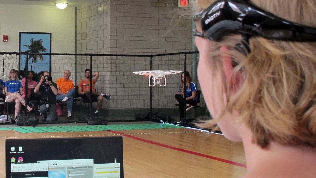 นักศึกษาของมหาวิทยาลัยฟลอริดา สวม เครื่องบังคับการทำงานของโดรน ด้วยความคิดในการทดลองที่เมืองเกนส์วิล รัฐ ฟลอริดา นักวิทยาศาสตร์ได้รู้จักคลื่นสมองมาตั้งนาน 1 ศตวรรษกว่าแล้ว แต่เพิ่งมีเครื่องมือราคาไม่สูงเกินไปนัก ในการตรวจวัดคลื่นสมอง เมื่อไม่นานมานี้เอง.