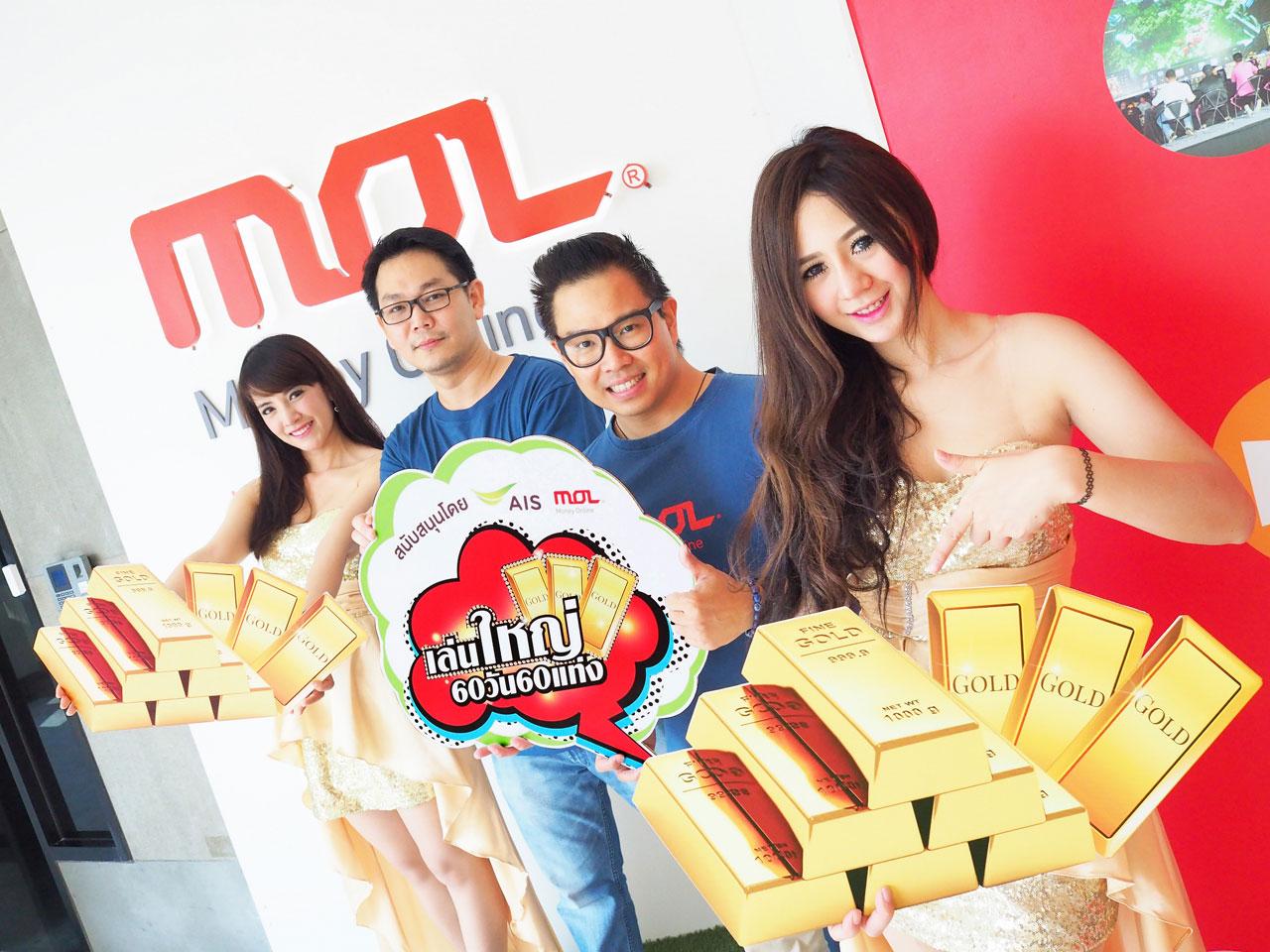 นายธชทัต นันทภัควงษ์ และ นายอดิศร พลนรัตน์ ผู้บริหาร บริษัท MOL เปิดตัวโครงการ “MOL เล่นใหญ่” ร่วมกับ AIS แจกทองคำมูลค่า 10,000 บาททุกวัน 60 วัน 60 รางวัล และแรร์ไอเทมกว่า 30 เกมรวมมูลค่ากว่าล้านบาท เพียงเติมเงินเข้าเกมผ่านช่องทาง MOL ด้วย บัตรเงินสด วัน-ทู-คอล! หรือ ค่าโทร เอไอเอส โดยกติกาเข้าร่วมกิจกรรมคือ ผู้ที่เติมเงินเกมด้วย บัตรเงินสด วัน-ทู-คอล! หรือ ค่าโทรเอไอเอส ผ่านช่องทาง MOL ในช่วงกิจกรรม จะได้ไอเทมพิเศษทันที ในต่อที่ 1 และ ทุกๆ 100 บาทจะได้รับ 1 สิทธิ์ เพื่อเข้าร่วมทายภาพปริศนาประจำวัน โดยผู้ที่ตอบคำถามภาพปริศนาได้ถูกต้องเป็นคนแรก จะได้รับรางวัลทองคำมูลค่า 10,000 บาท ในต่อที่ 2