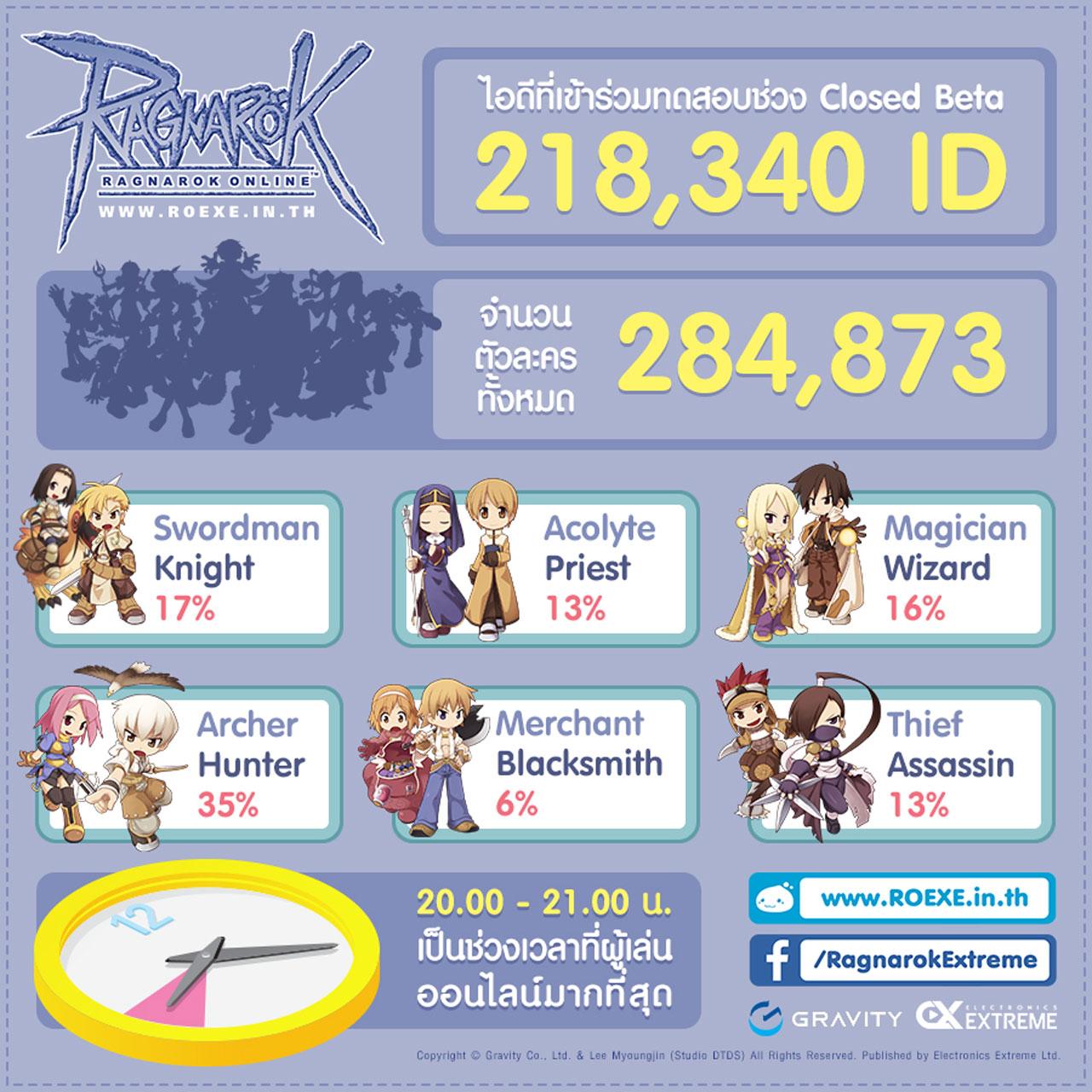เมื่อวันที่ 13 ก.ค.2559 ทีมงาน Ragnarok Online Thailand ภายใต้การให้บริการของ Electronics Extreme เผยข้อมูลผู้เข้าร่วมทดสอบเกม Ragnarok Online ช่วงโคลสเบต้า (CBT) ระหว่างวันที่ 8 – 11 ก.ค.ที่ผ่านมา โดยเปิดให้ผู้เล่นเข้าร่วมทดสอบช่วง CBT กับแพทช์ ก็ได้รับกระแสตอบรับจากผู้เล่นอย่างล้นหลาม เรียกได้ว่าเดินไปไหนก็เห็นตัวละครสวมหมวกไข่กันเต็มไปหมด