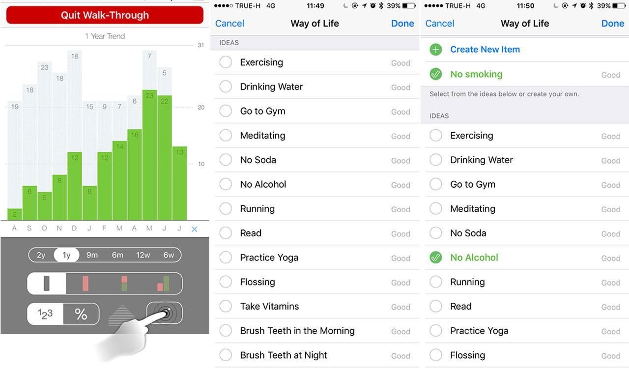 แอพนี้เป็นแอพที่ช่วยให้เราเปลี่ยนนิสัยโดยรวมของเราได้เอง โดยเราสามารถตั้งเป้าที่จะทำกิจกรรมที่ส่งผลดีกับชีวิตเช่น ดื่มน้ำ ออกกำลังกาย เล่นโยคะ ดื่มนม สวดมนต์ ฯลฯ และหลีกเลี่ยงพฤติกรรมด้านลบบางอย่าง เช่น ดื่มเหล้า สูบบุหรี่ ดื่มกาแฟเกินขนาด ดูทีวีมากไปฯลฯ โดยจดบันทึกไว้เป็น Journal ว่าวันนี้ทำอะไรได้ตามเป้าบ้าง จดทุกวัน โดยแอพก็จะมี Notification แจ้งเตือน เมื่อถึงเวลาที่กำหนดด้วยว่า “ถึงเวลากรอกข้อมูลแล้วนะ” เมื่อทำไปเรื่อยๆ ก็จะเป็นชุดข้อมูลที่ให้เราดูพฤติกรรมย้อนหลังของเราเป็นกราฟได้ด้วยว่า อัตราส่วนความสำเร็จกับความล้มเหลวของเราเป็นอย่างไรบ้าง ดูได้ตั้งแต่แบบรายสัปดาห์ รายเดือน รายปี ฯลฯ แอพนี้ก็ค่อนข้างอิสระ แต่ก็ออกแบบมาทำให้เรามีแรงจูงใจในการทำเป้าหมายได้ดี ยิ่งเห็นสีเขียวเยอะ ยิ่งรู้สึกดี หรือช่วงไหนกราฟเป็นสีแดงเยอะก็จะเป็นแรงผลักดันให้ตัวเองลุกขึ้นสู้ใหม่ ดาวน์โหลดฟรีเช่นกันค่ะ iOS