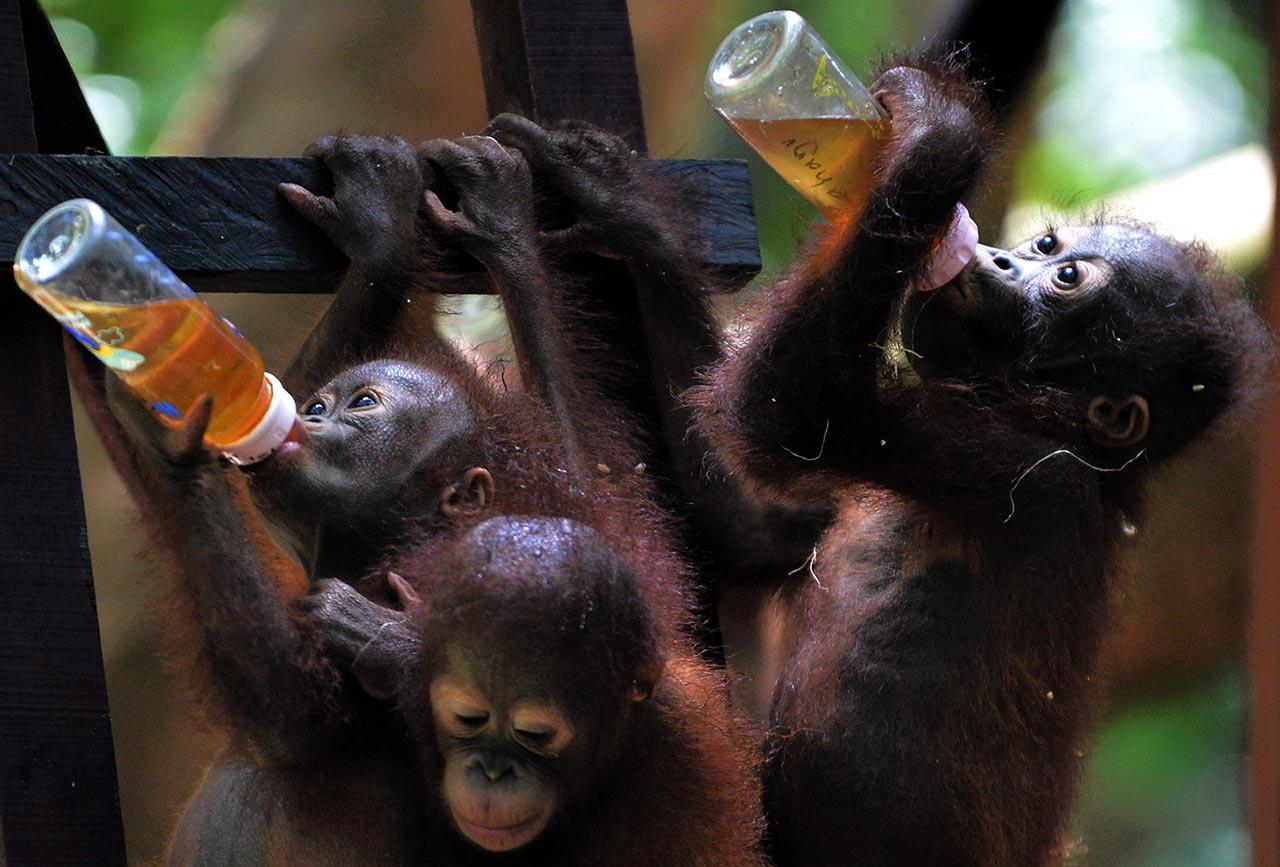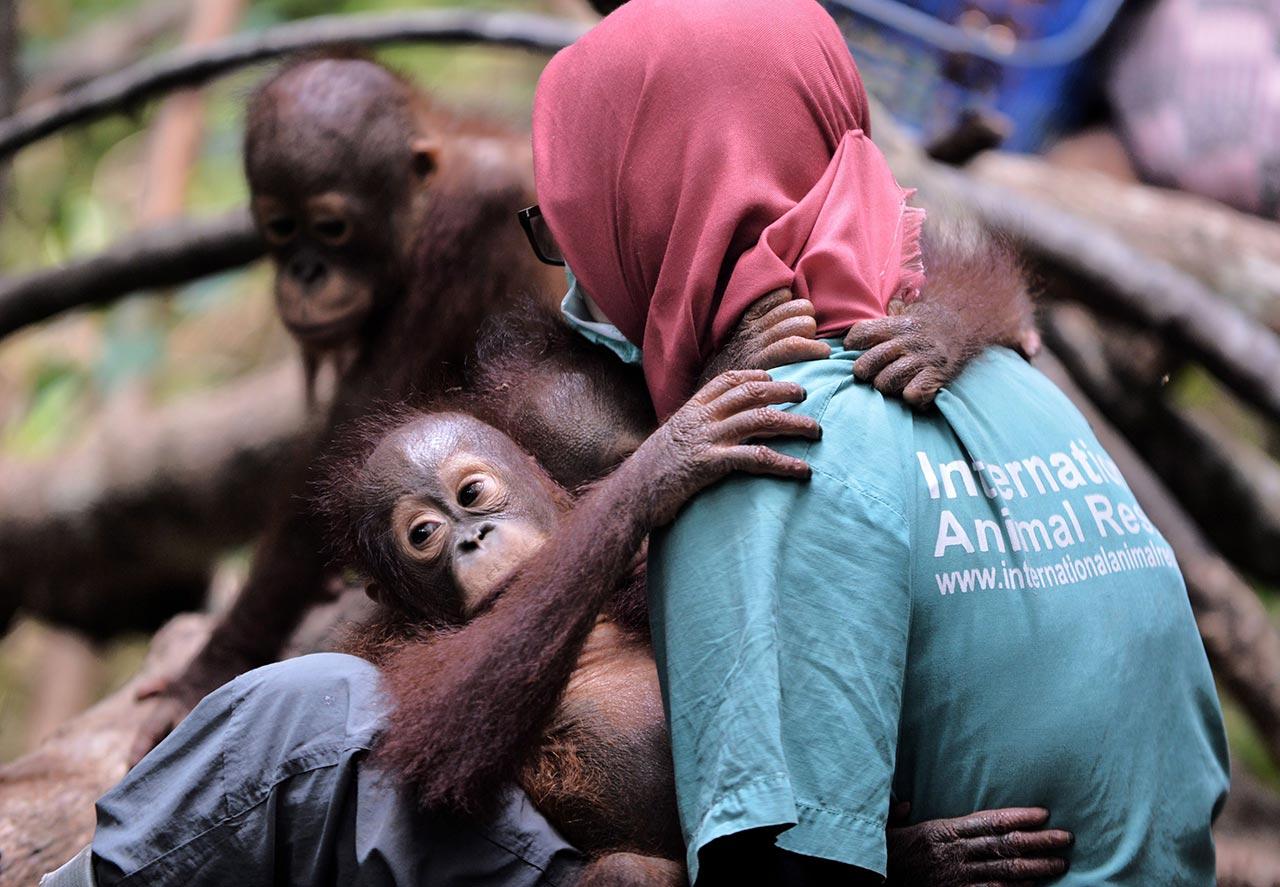 ลิงอุรังอุตังกำพร้าห้อยโหนต้นไม้อยู่ในเขตโรงเรียนป่าของศูนย์ช่วยเหลือสัตว์สากล นอกเมืองเคตาปัง ในดินแดนกาลีมันตันตะวันตก โดยมีเจ้า “อุตัง” เป็นดาราฝึกการแกว่งการห้อยโหนอยู่ลำพังตัวเดียว เอาหัวลงบ้าง จากกิ่งไม้ในระยะสูง เจ้าวานรตัวนี้นับว่าเก่งกล้ามาตั้งแต่อ้อนแต่ออก เพราะคนไปพบมันล้มอยู่ในไร่ปาล์มเพียงลำพัง ซ้ำกำลังโดนควันจากไฟป่าที่ชาวไร่ชาวนาจุดไฟถางป่า เพื่อเอาที่ทำไร่นา จนแทบจะเอาชีวิตไม่รอด พวกมันต่างได้รับการเลี้ยงดูจากเจ้าหน้าที่ของศูนย์ใช้น้ำขวดให้มันกินแทนน้ำที่มีอยู่ในป่า บางทีหาเพื่อนไม่ได้ ก็หยอกล้อกับพี่เลี้ยง.