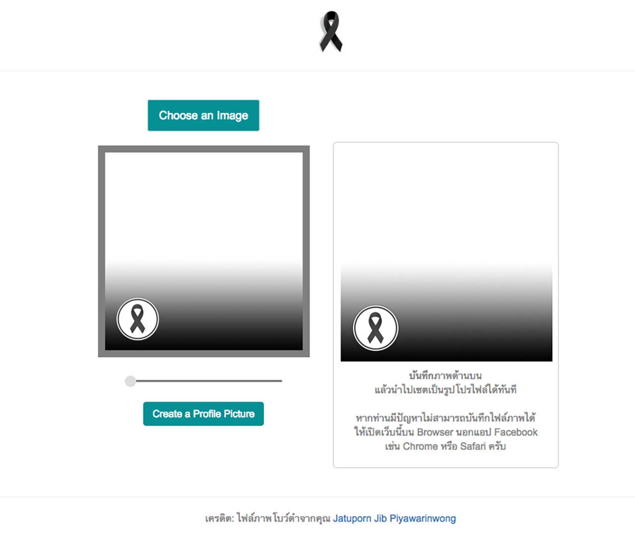 ล่าสุด เริ่มมีกระแสการแสดงความอาลัยผ่านภาพโปรไฟล์บนสื่อออนไลน์ในรูปแบบริบบิ้นสีดำ โดยมีความพิเศษอยู่ที่สามารถทำได้ง่ายผ่านเว็บไซต์ เราจึงขอรวบรวมขั้นตอนง่ายๆ สำหรับการใช้งานมาฝากไว้ ณ ที่นี้ เผื่อเป็นทางเลือกในการเปลี่ยนภาพโปรไฟล์จากสีดำล้วน หรือแบบตัวอักษรที่ใช้งานอยู่ในปัจจุบัน ให้เป็นภาพถ่ายส่วนตัวพร้อมติดริบบิ้นสีดำเพื่อแสดงความอาลัย