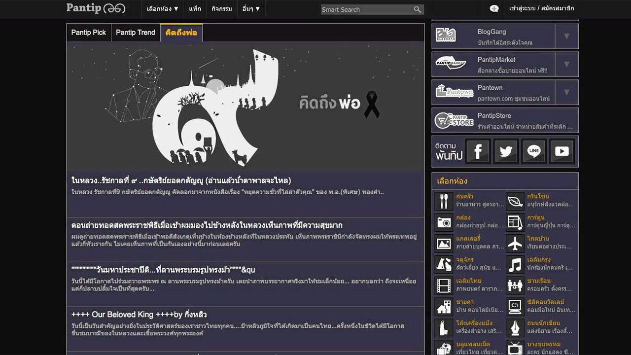 ช่วงเวลานี้น้ำใจไทยต่างรวมเป็นหนึ่งเดียว เพื่อน้อมรำลึกถึงพระมหากรุณาธิคุณ พระบาทสมเด็จพระปรมินทรมหาภูมิพลอดุลยเดช ล่าสุด Pantip.com เว็บบอร์ดชื่อดังที่อยู่คู่นักเลงคีย์บอร์ดไทยมายาวนาน 20 ปี ได้เปิดพื้นที่พิเศษ “Tab คิดถึงพ่อ” ที่รวบรวมกระทู้เกี่ยวกับ “ในหลวง รัชกาลที่ 9” ซึ่ง อภิศิลป์ ตรุงกานนท์ ผู้ร่วมก่อตั้งและประธานเจ้าหน้าที่เทคโนโลยีเว็บไซต์ Pantip.com กล่าวว่า ตลอดระยะเวลา 20 ปีที่ผ่านมา พันทิปพัฒนาอย่างต่อเนื่องในรูปแบบต่างๆ เพื่อตอบสนองความต้องการของผู้ใช้งาน ทำให้เกิดสังคมแห่งการแบ่งปัน เรียนรู้ มิตรภาพ และประสบการณ์ใหม่ๆขึ้นมากมาย นำไปสู่การเป็นเว็บไซต์ที่มีคำตอบสำหรับทุกคำถามของคนไทย