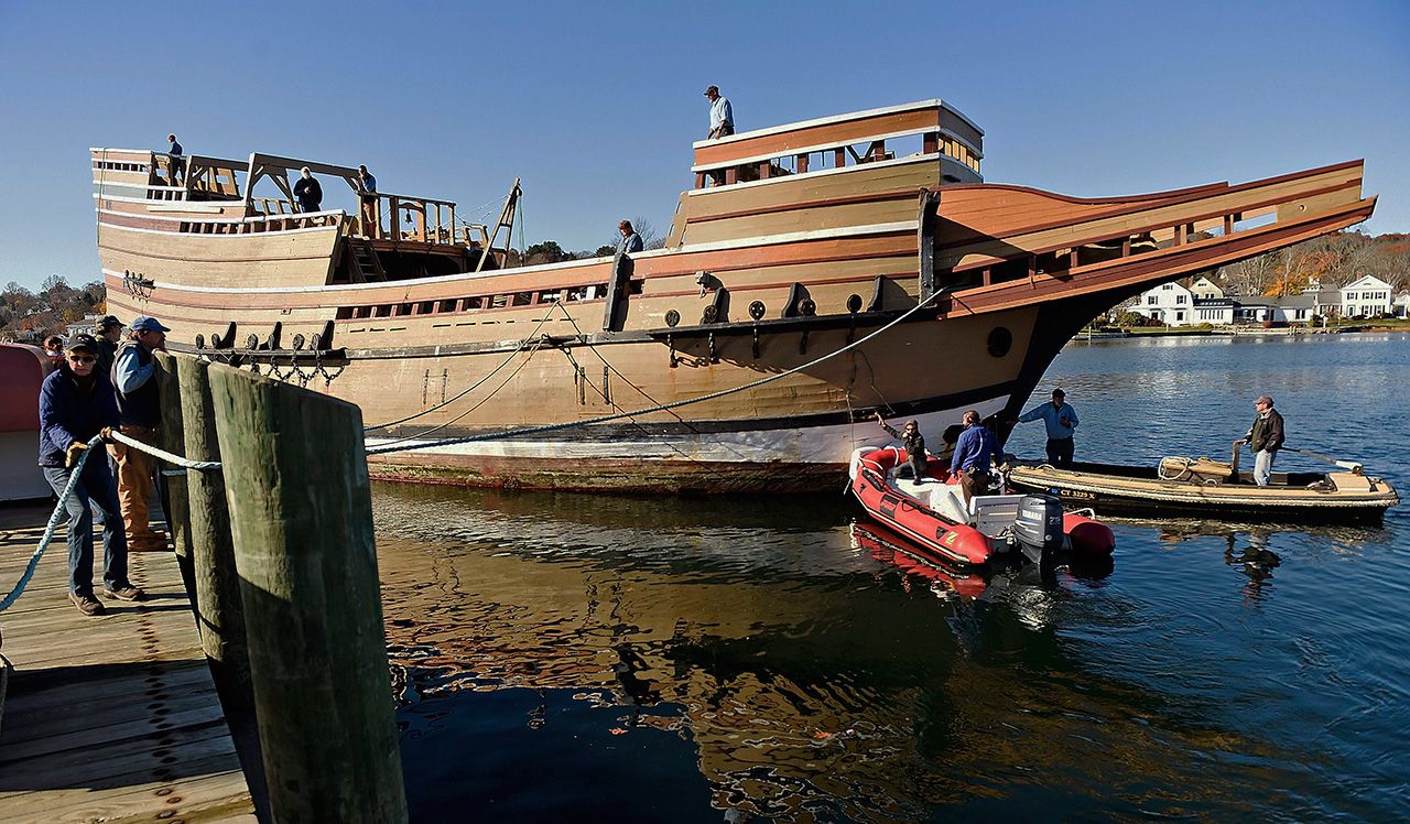 คนงานที่ท่าเรือมิสติคซีพอร์ต เคลื่อนเรือ “เมย์ฟลาวเวอร์ II” ลงเรือยก ออกจากอู่อนุรักษ์เรือ เฮนรี บี. ดูปองต์ ริมแม่น้ำมิสติค เมืองโสตนนิงตัน รัฐคอนเนกติกัต เรือนี้จำลองจากเรือที่นำนักแสวงบุญไปยัง “โลกใหม่” อเมริกา เมื่อปี 1620 สหรัฐอเมริกาจะจัดงานเฉลิมฉลองครบรอบ 400 ปี คณะนักบุญขึ้นฝั่งทวีปอเมริกาในปี 2020.