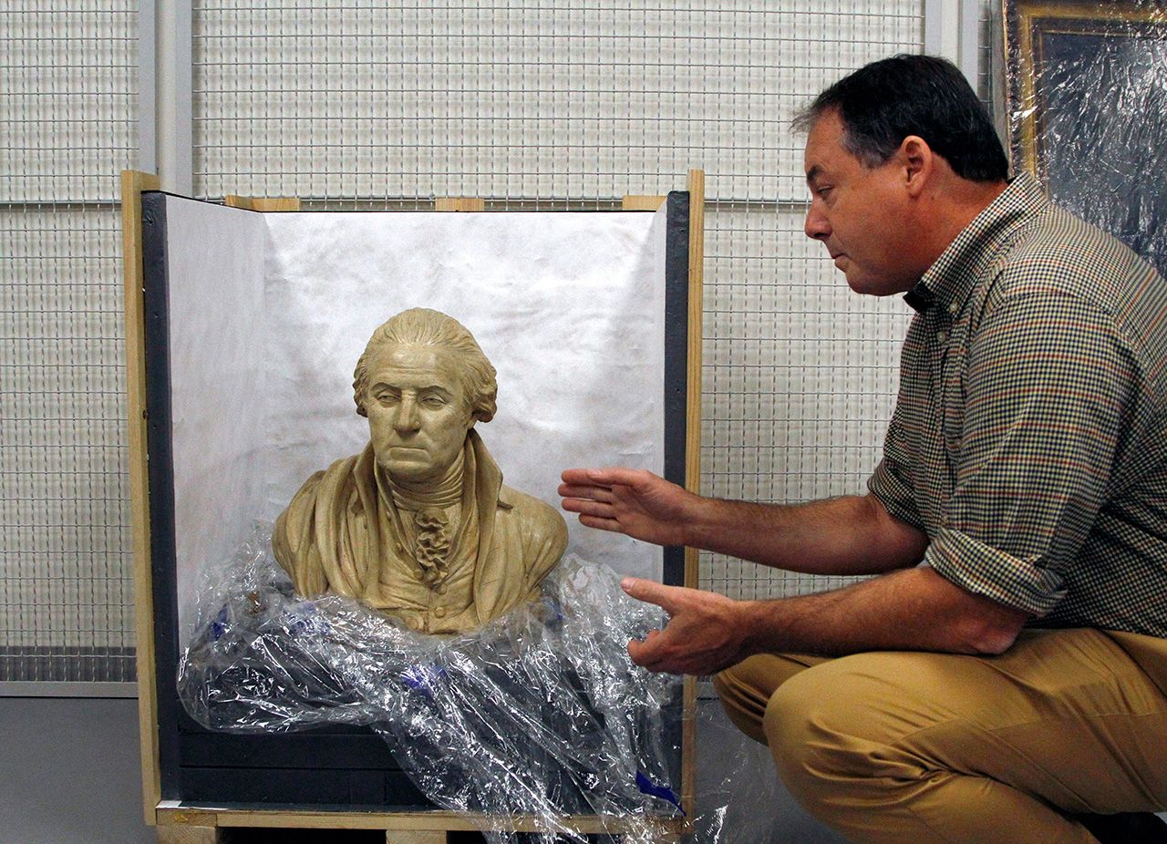 ดร.อาร์.สก๊อต สตีเฟนสัน โชว์รูปหล่อปูนปลาสเตอร์ครึ่งตัวของอดีตประธานาธิบดี จอร์จ วอชิงตัน แห่งสหรัฐอเมริกา หล่อโดย วิลเลี่ยม รัช เมื่อปี 1817 ให้ผู้สื่อข่าวดู ที่พิพิธภัณฑ์ปฏิวัติอเมริกัน นครฟิลาเดลเฟีย รัฐเพนซิลเวเนีย.