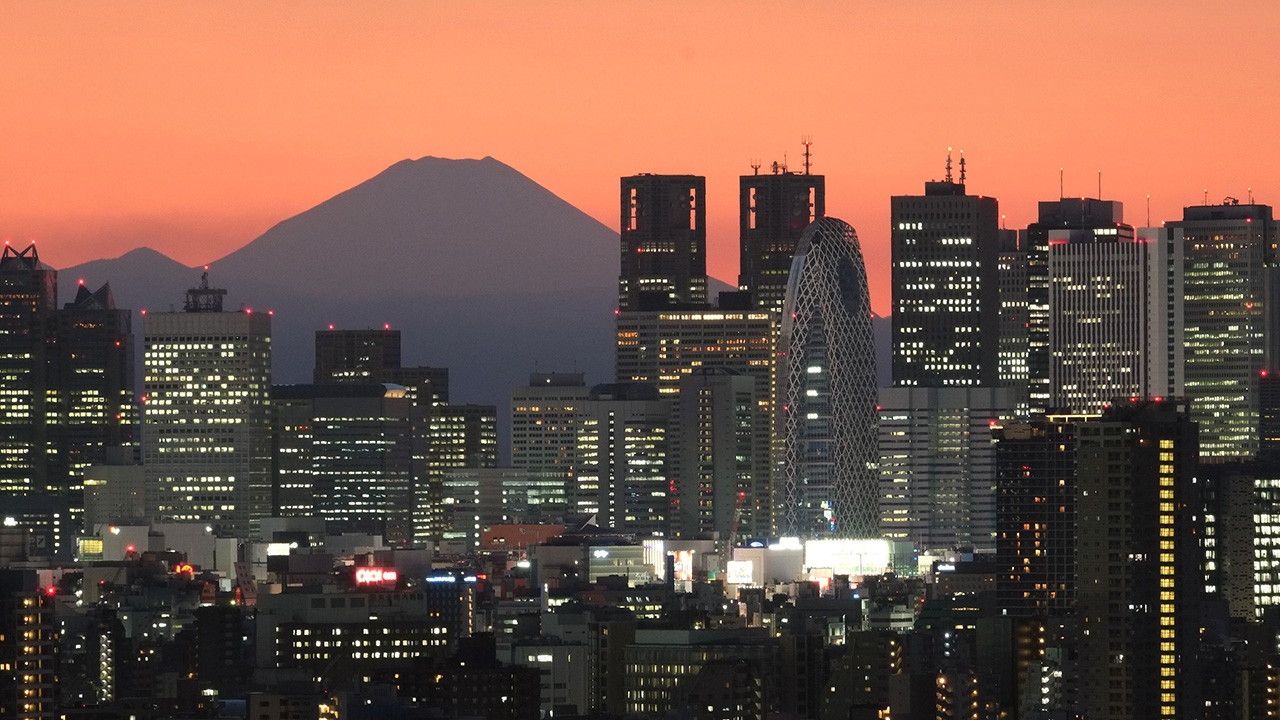 ภูเขาไฟฟูจิที่สูง 3,776 เมตร ช่วงพระอาทิตย์กำลังตกดิน อยู่เบื้องหลังตึก ระฟ้าเมื่อมองจากย่านชินจูกุในกรุงโตเกียวเมื่อวันที่ 4 มก-ราคม ซึ่งเป็นวันแรกของการเปิดค้าขายที่มีแรงหนุนในแง่ดีกว่าเศรษฐกิจสหรัฐอเมริกา.