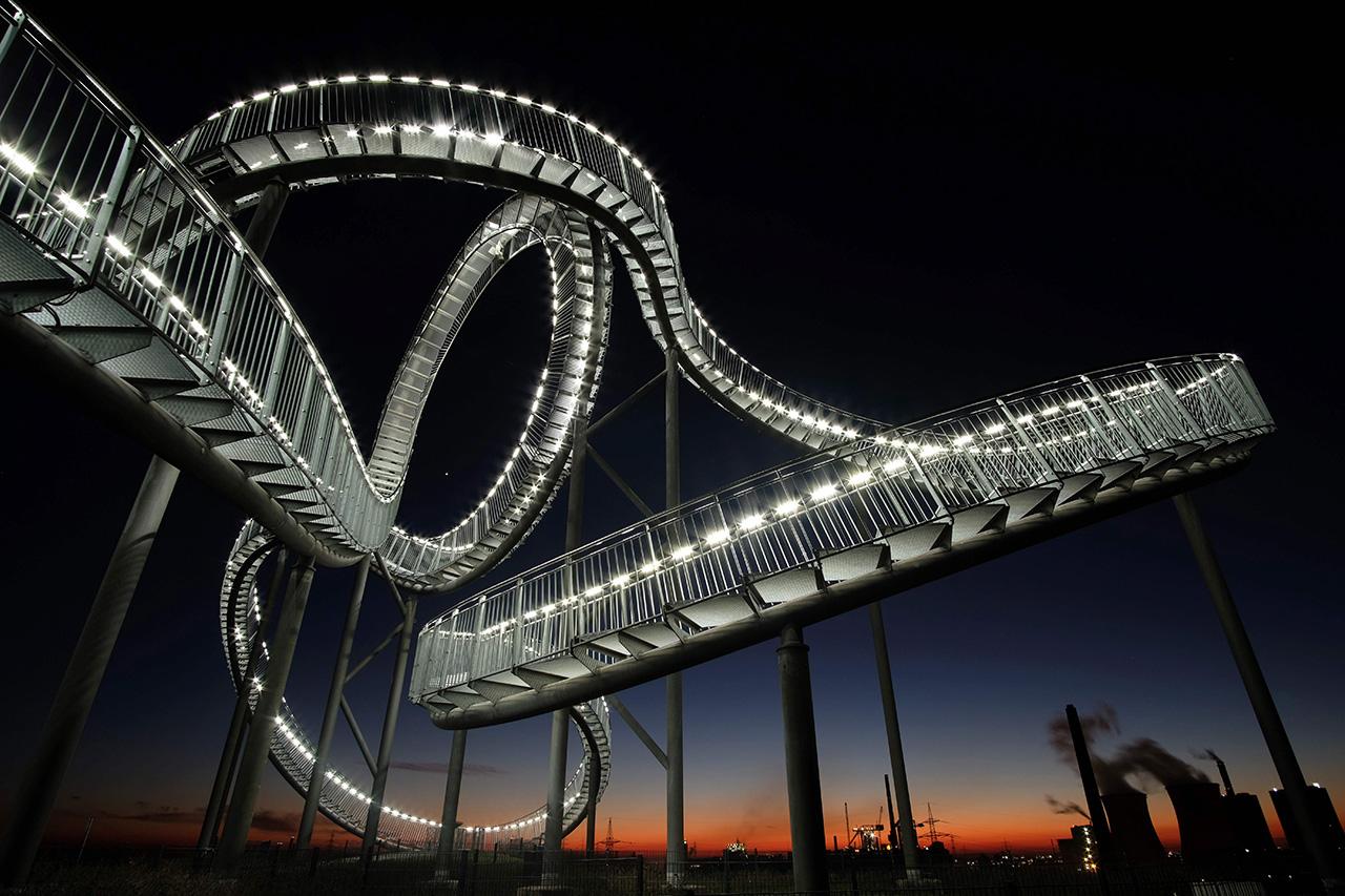 ภาพถ่ายมุมแปลกตายามค่ำคืนของประติมากรรมกลางแจ้งประดับไฟ LED ที่มีรูปทรงคล้ายรถไฟเหาะตีลังกาชื่อ Tiger and Turtle-Magic Mountain สร้างจากเหล็ก สังกะสี และดีบุก สูง 20 เมตร มีขั้นทางเดิน 249 ขั้น ยาว 220 เมตร โดย 2 ประติมากรคือ อุลริค เกนท์ และไฮเก มุตเตอร์ นำแนวคิดเปรียบความเร็วของเสือเป็นเหมือนรถไฟเหาะ เมื่อคนขึ้นไปต้องเดินต้วมเตี้ยมใช้เวลานานเหมือนเต่า งานศิลปะชิ้นนี้ตั้งอยู่ที่แองเกอร์พาร์ค เมืองดุยส์บูร์ก ในเยอรมนี.
